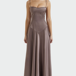 Elegantní saténové maxi šaty s tenkými ramínky v sobě spojují nadčasovou jemnost s moderním minimalistickým stylem. Saténový materiál s jemným leskem, lehká ramínka a precizní švy dávají vzniknout ženské a vytříbené siluetě, která zaujme na každé významné příležitosti.