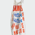 Výrazný potisk je inspirovaný tradiční rybářskou tržnicí: živé červené a modré detaily s nápisy "SARDINES", "FRESH FISH", "FISH MARKET" a stylizovanými rybami tvoří jedinečný, hravý vzhled.