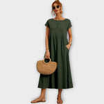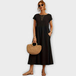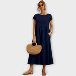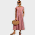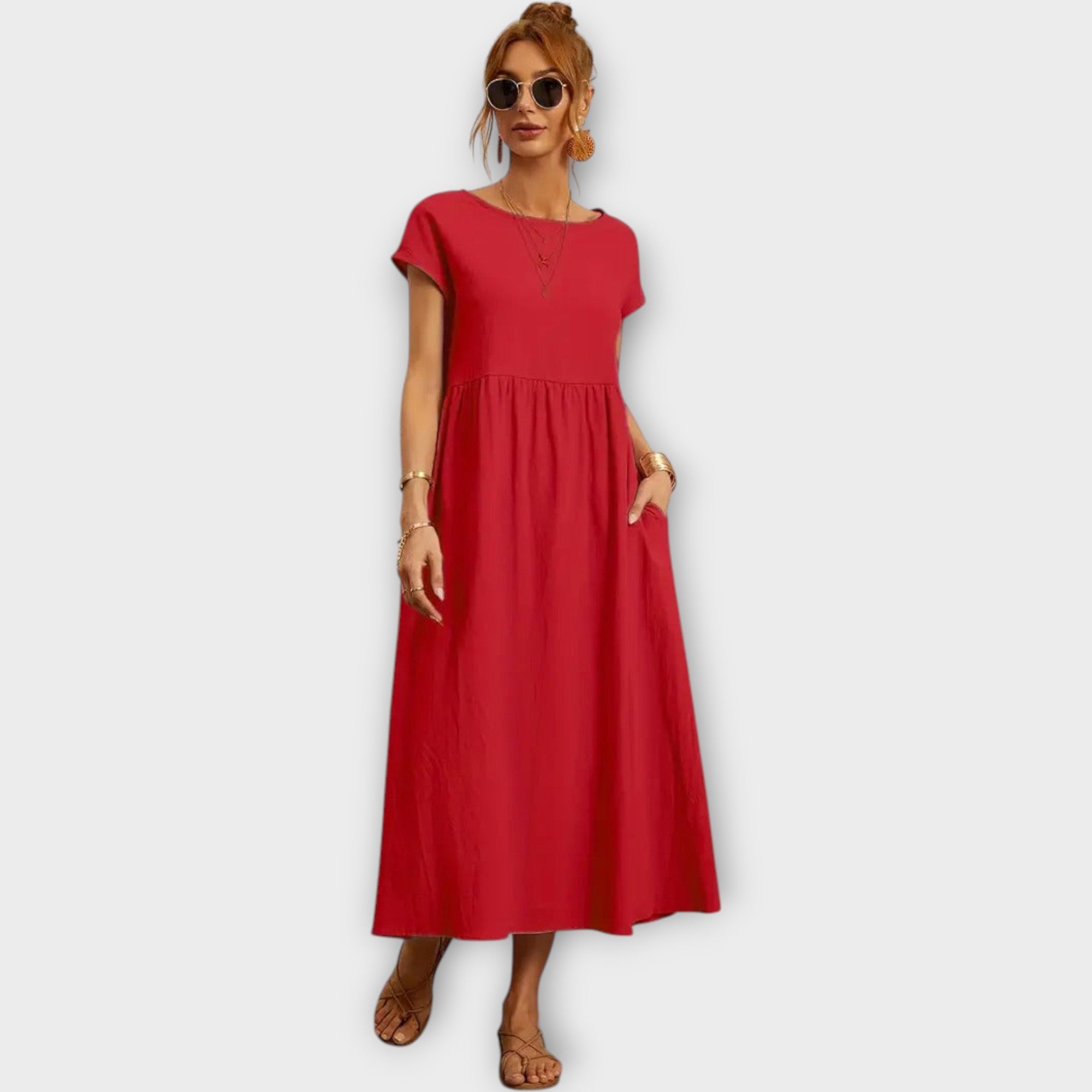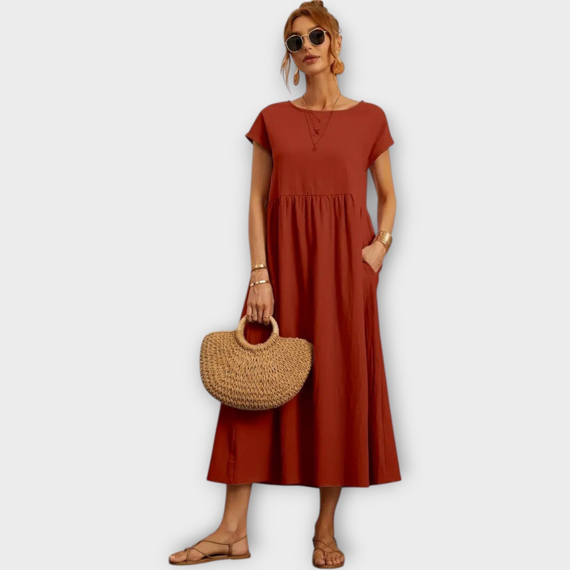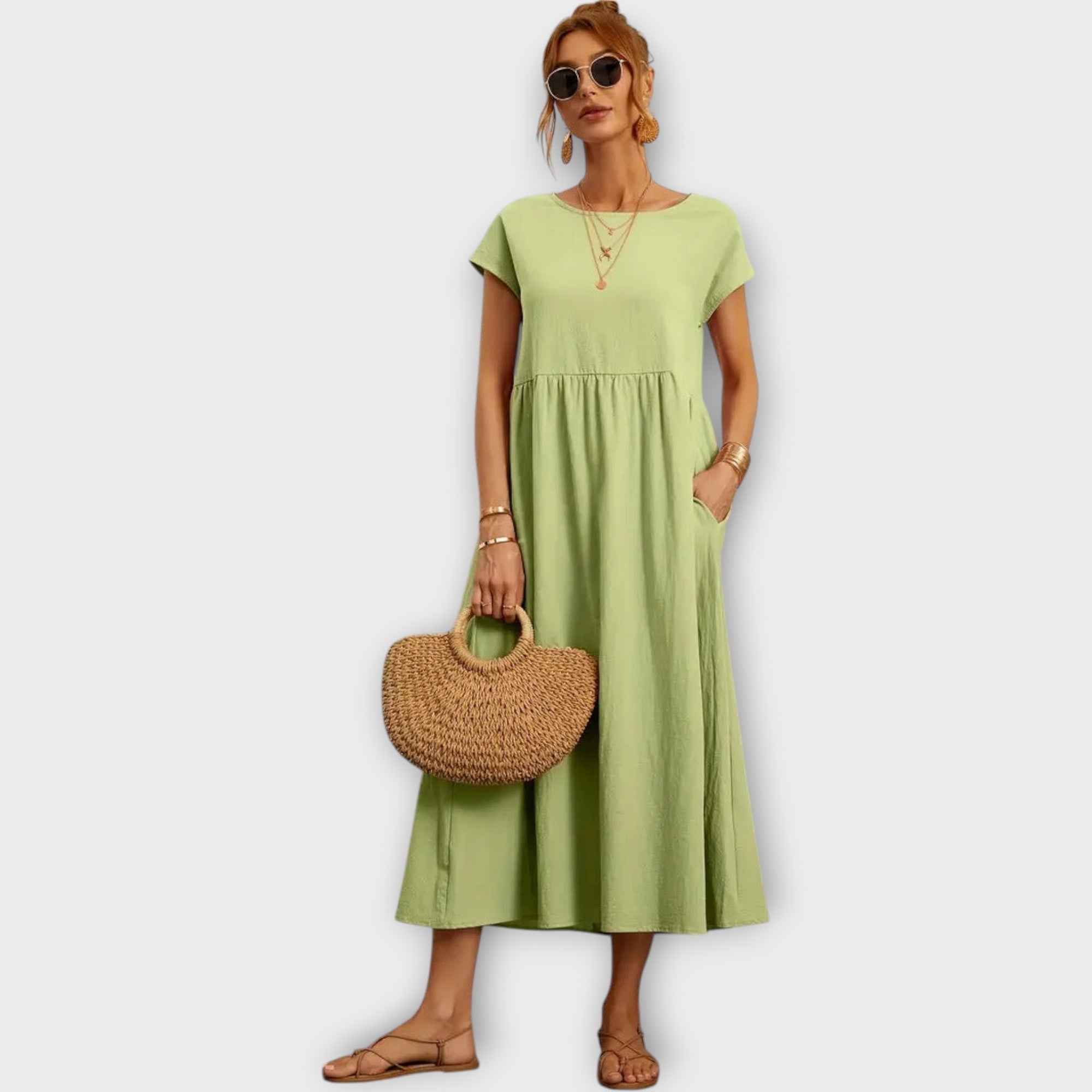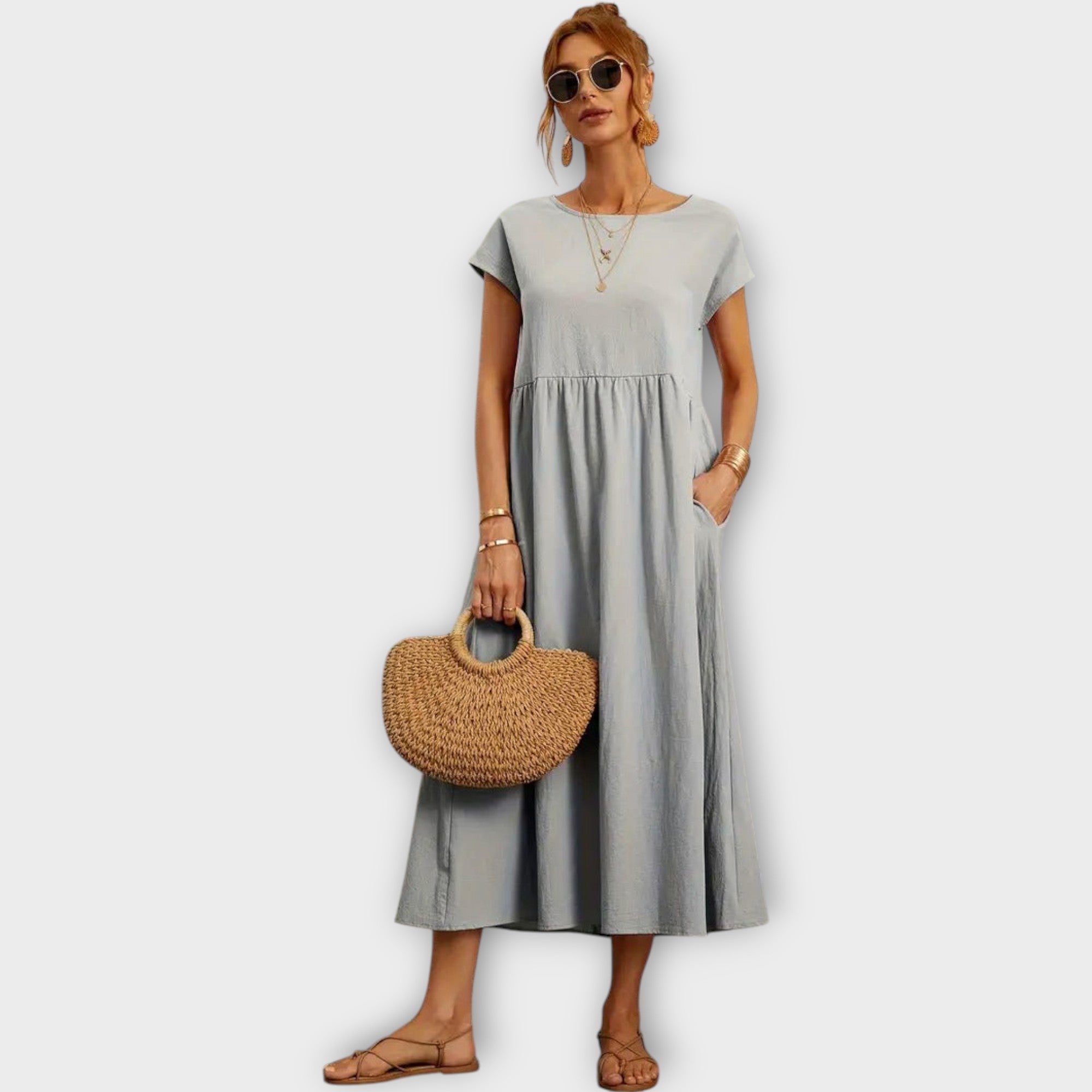Lehké šaty s elegantní linií představují dokonale vyvážené spojení vzdušnosti a nadčasové jednoduchosti. Tento model vyzval nenucenou eleganci a praktický šarm, který oceníte každý den.