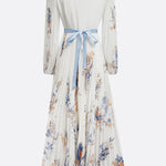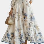 Dlouhé šaty s nabranými rukávy a výstřihem do V jsou ztělesněním ženské elegance. Hluboký dekolt, lehká plisovaná textura a decentní květinový vzor zajistí lehký, vzdušný pohyb a aristokratický styl pro každý okamžik.