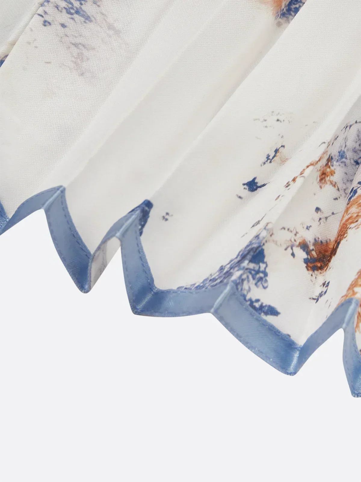 Jemná, lehká látka s plynulými pixely plisování objímá tvar těla a dodává šatům slavnostní nádech. Ozdobná tenká modrá páska v pase podtrhuje linii postavy a dodává šatům mimořádnou eleganci při každém kroku.