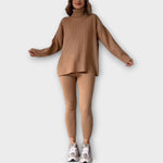 Pletený set s moderní estetikou je elegantní a univerzální kousek, který se bez námahy přizpůsobí jakémukoli stylu a dodá vašim outfitům dokonalou tečku.