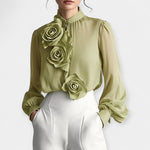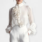Elegantní bílá blůza s trojrozměrnými růžemi dodává šatníku nadech romantiky a luxusu. Vysoký límec a jemně průsvitný šifonový materiál vytváří vzdušnou a vytříbenou siluetu, která se hodí ke každé příležitosti.
