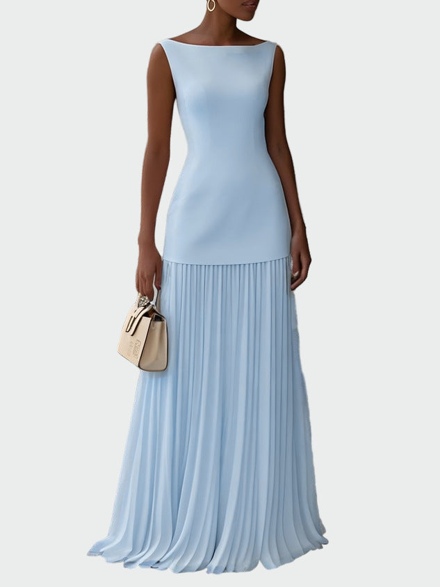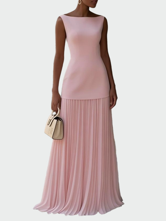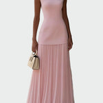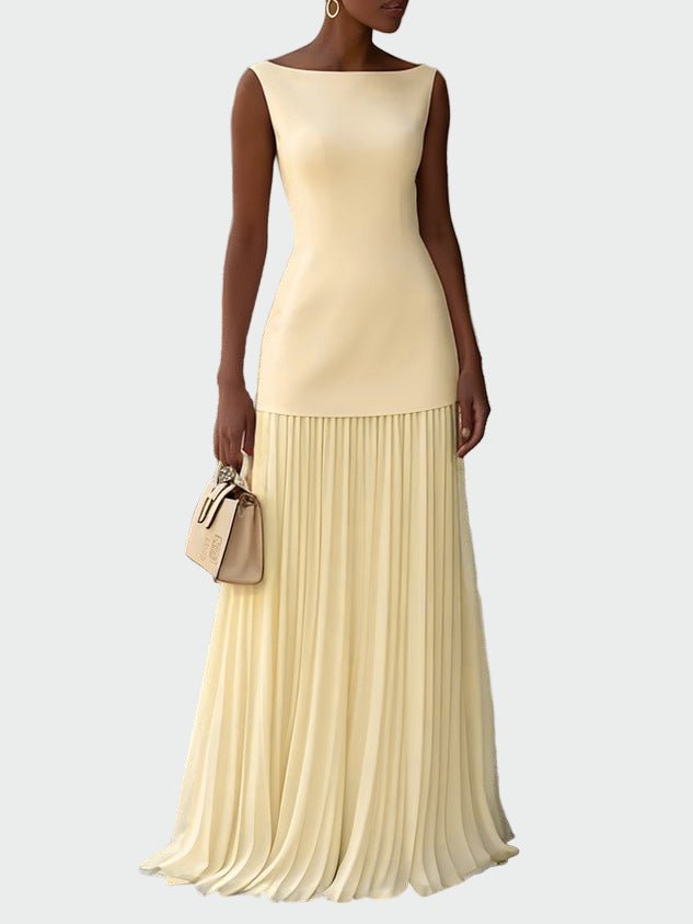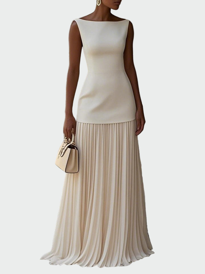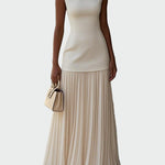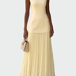 Ženské dlouhé plesové šaty v krémové barvě vyzařují elegantní a nadčasovou jemnost. Těsný vršek krásně obepíná postavu, zatímco lehká plisovaná maxi sukně dodává pohyb a ženskost.