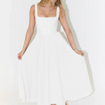 Elegantní midi šaty s romantickým střihem představují dokonalost pro každou výjimečnou příležitost. Díky čistému liniím a vytříbenému designu působí nadčasově a vyzařuje jemnou ženskost. Čtvercový výstřih decentně podtrhuje krásu dekoltu a dodává šatům elegantní nádech. Lehká, vzdušná silueta zajišťuje pohodlí a volný pohyb v každém kroku. Ideální pro formální příležitosti: svatby, křty či večerní události. Současná minimalistická estetika nabízí kombinaci se šperky a doplňky.