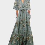 Okouzlete romantikou a ženskostí s tímto elegantním maxi šaty s květinovým vzorem a páskem. S hlubokým ve výstřihu, 3/4 rukávy a lehkou, vzdušnou siluetou jsou ideální volbou pro letní akce a slavnostní večeři. Delikátně vyšívaný květinový motiv dodává šarm a vytříbenost.