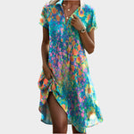 Vintage Boho šaty s V-dekoltem s jemným, pestrým květinovým motivem jsou ideální volbou pro slunečné dny, dovolené a procházky na venkově. Kombinují komfort a svěží styl díky živým barvám, které okamžitě upoutají pozornost a dodají šmrnc každému kroku.