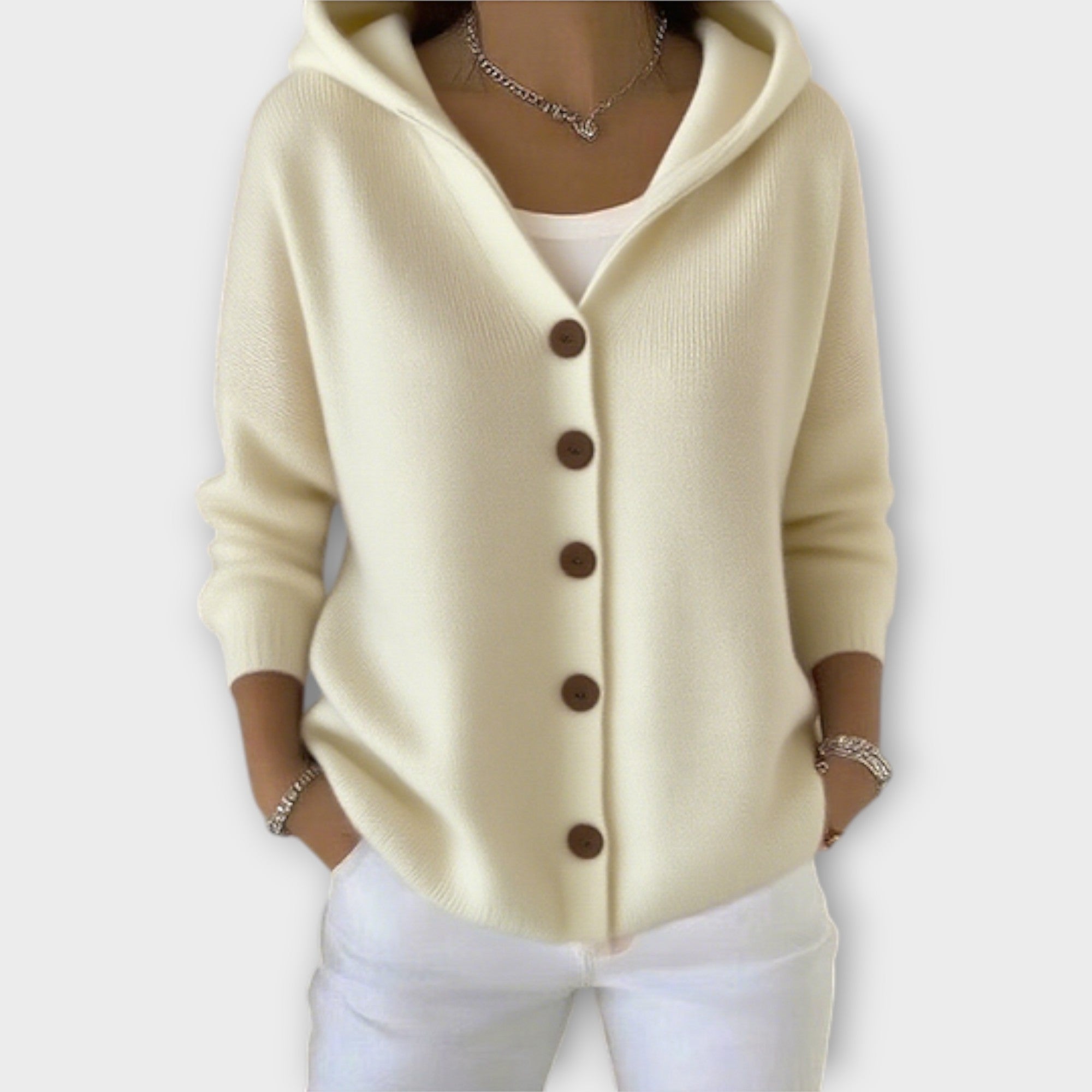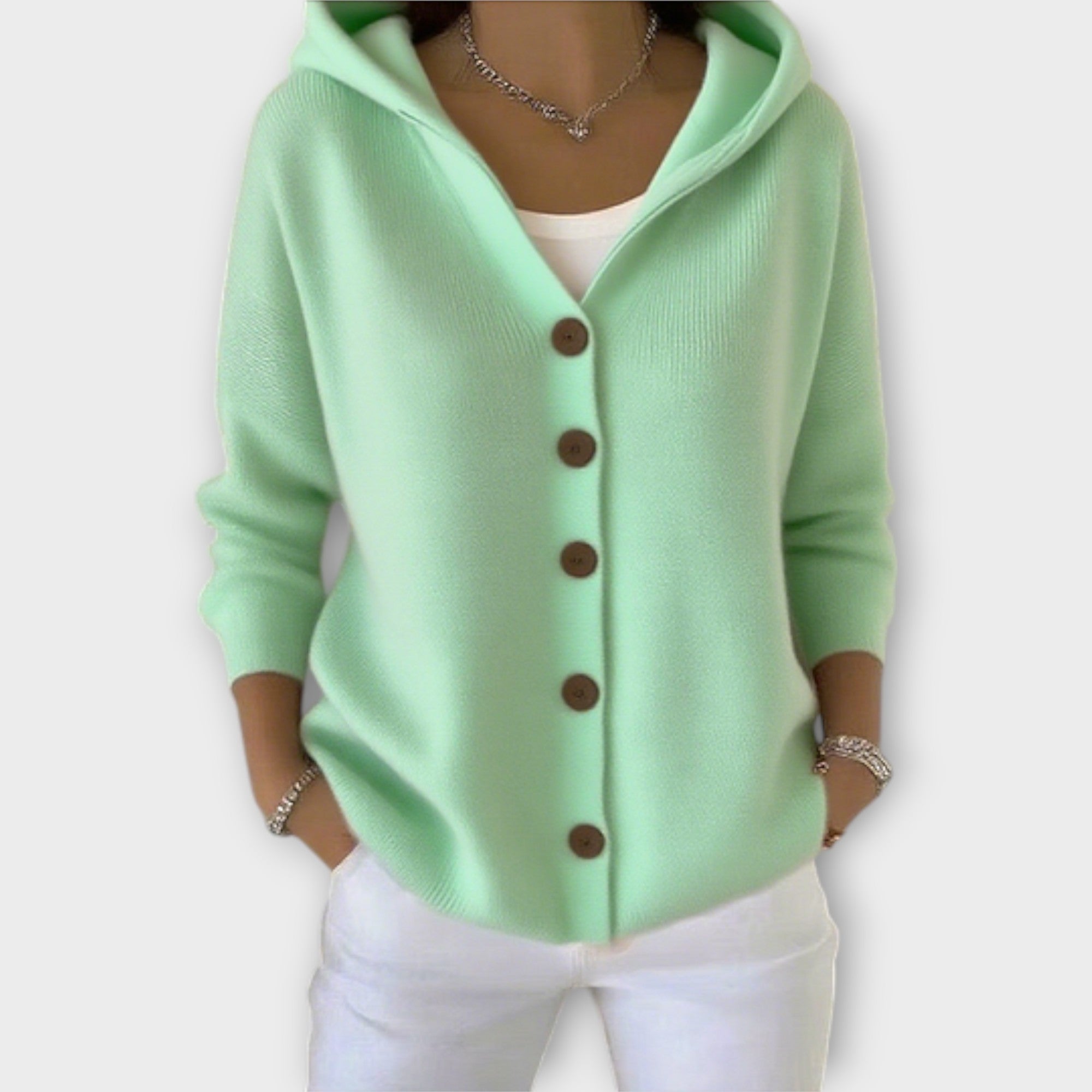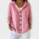Dámská pletená kardigan s kapucí spojuje pohodlí a ženskost a je optimální volbou pro chladnější dny.