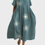 Lehká a vzdušná silueta nabízí pohodlí po celý den, zatímco jemný, umělecký motiv pampelišek dodává šatům romantickým šarm. Perfektní volba pro ženy, které chtějí spojit přírodní jednoduchost s elegantní estetikou.