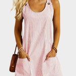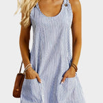 Letní pruhované šaty bez rukávů s tenkými ramínky a kapsami jsou ideální volbou pro horké dny. Krátký střih, příjemné pohodlí a vždy stylové provedení – perfektní do města, na dovolenou i na pohodlný brunch.