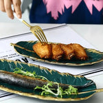 - Naše listové keramické tác jsou pečlivě vyrobené a zdobené nádhernými zlatými okraji, navržené tak, aby zvýraznily prezentaci vašich oblíbených kulinářských výtvorů.