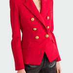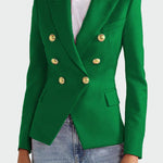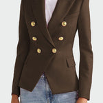 Dvojité zapínání se zlatými knoflíky – výrazný detail, který dodává charakter a styl.