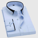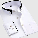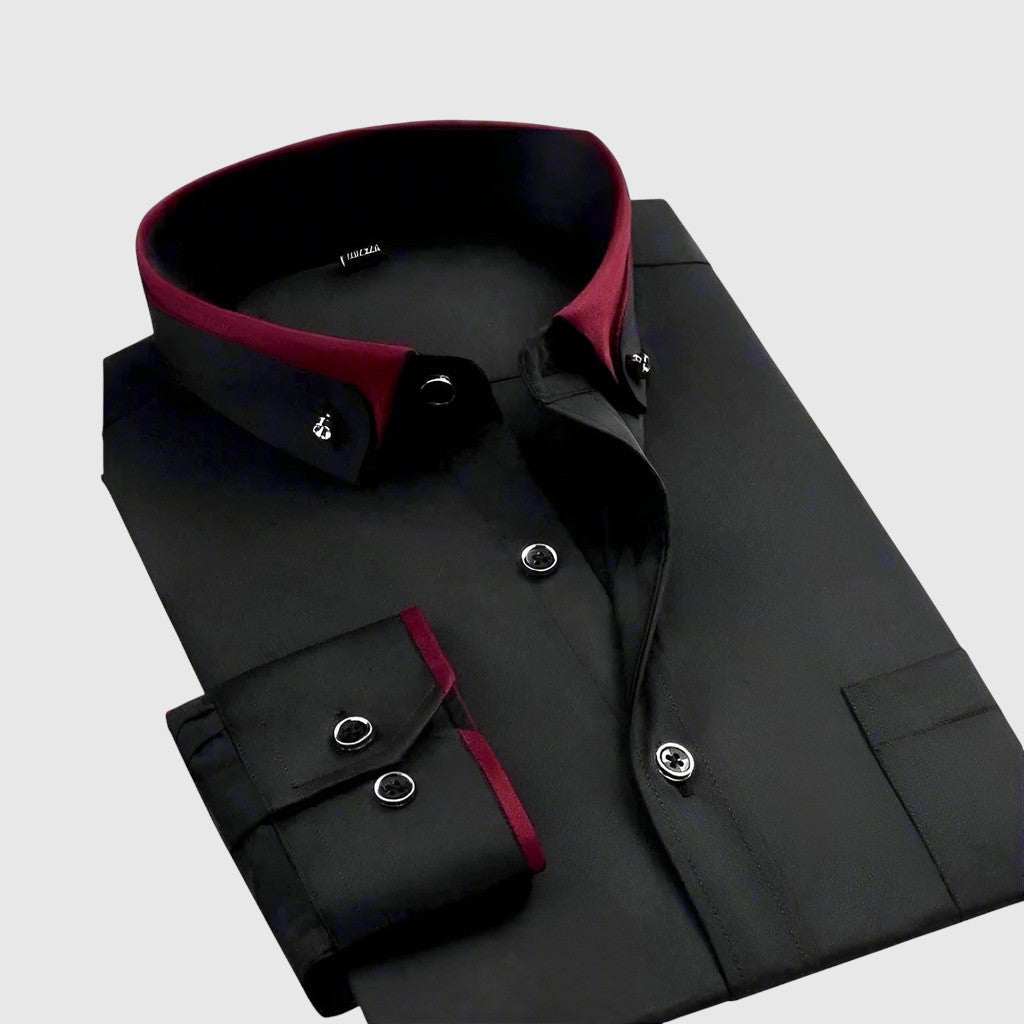 Pánská košile s klasickým límcem, čistou légou a decentním kontrastem na vnitřku límce a manžet. Knoflíky s kovovým lemem podtrhují precizní vzhled. Střih je pohodlný po celý den – od kanceláře po večerní setkání.