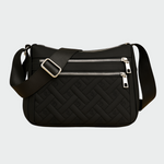 Moderní dámská taška přes rameno v černé barvě, s prošívaným vzorem pleteniny, který dodává moderní a elegantní charakter. Obsahuje dvě vnější kapsy na zip pro snadnou organizaci a široký nastavitelný popruh, který poskytuje pohodlí při používání. Ideální volba pro každodenní vzhled s praktičností a stylem.