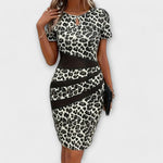 Zvýrazněte svou siluetu těmito nápadnými šaty s leopardím vzorem, které kombinují moderní design s ženským výstřihem do tvaru klíče.