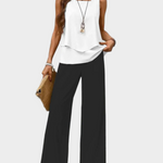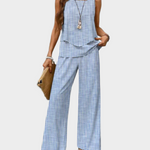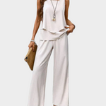 Objevte lehkost a styl v jednom letním kompletu pro ženy. Tento set spojuje sofistikovanou bez rukávů blůzu se širokými kalhotami s motivem listů, čímž vytváří volný dokonalý vzhled pro horké dny, čas i dovolené.