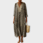 Objevte Maxi Boho design šaty Ária – dokonalé spojení umění a jednoduchosti. Tento kousek je ideální volbou pro pláž, cestování i volné letní dny, kdy chcete působit lehce, a přitom stylově. Geometrický tisk se vzorem pruhů dodává šatům pohyb a šmrnc, aniž by ztratil jejich nakažlivou lehkost.