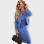 Vysoce kvalitní elastický materiál kombinuje pružnost, pohodlí a odolnost, takže se o vás stará po celý den. Fitted šaty zdůrazňují linii těla a krátké sako na knoflíky dodává outfitu autoritu a eleganci. Celý set je navržen pro snadnou kombinaci a bezproblémové vrstvení – minimalistický styl, který nikdy nevyjde z módy.