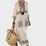 Užijte si letní atmosféru s tímto elegantním kaftánem, který splývá s tělem a nabízí boho šarm s nenápadnými modrými pruhy. Ideální volba pro dovolenou u moře i pro procházky po ostrovních uličkách — lehce tak vyniknete v každém okamžiku.