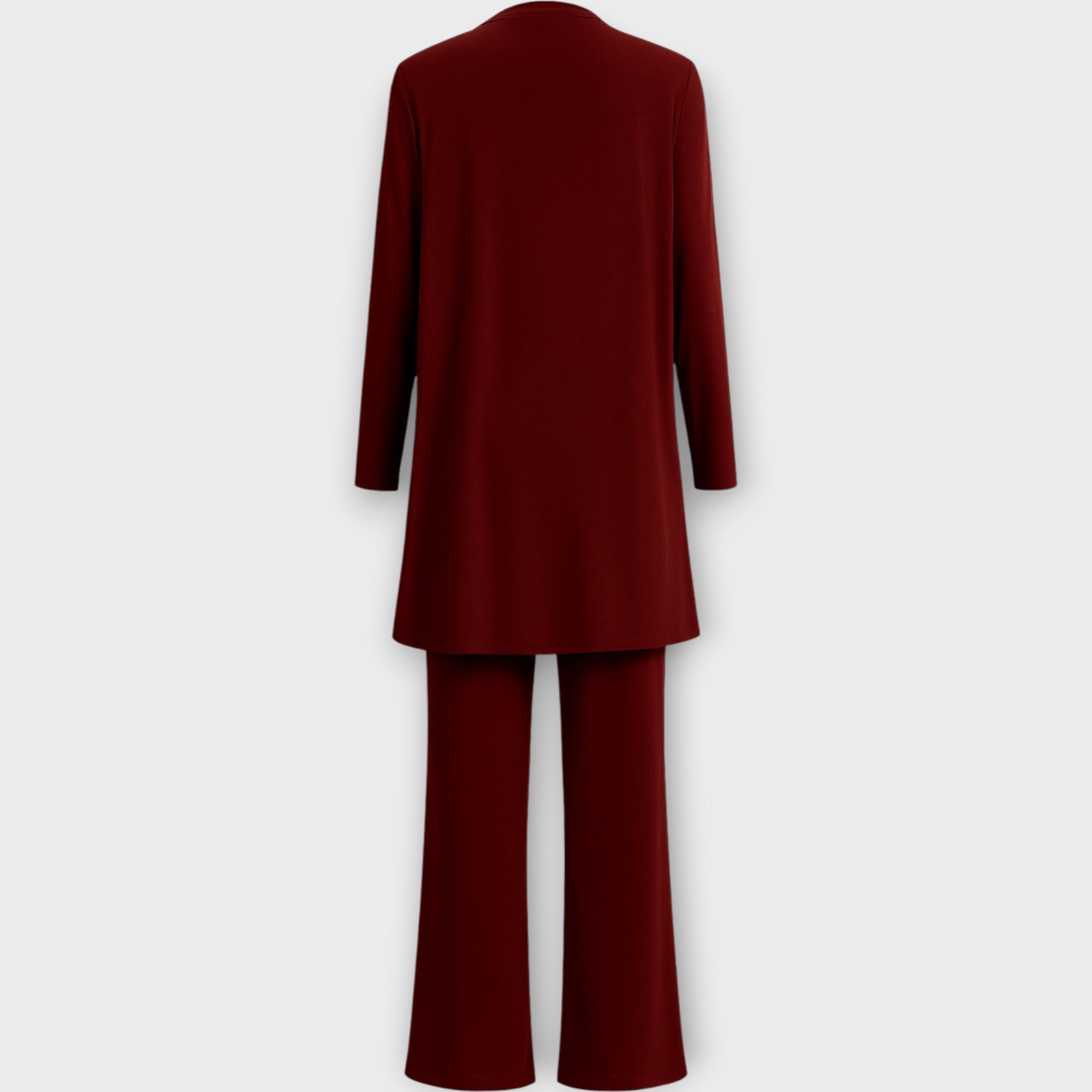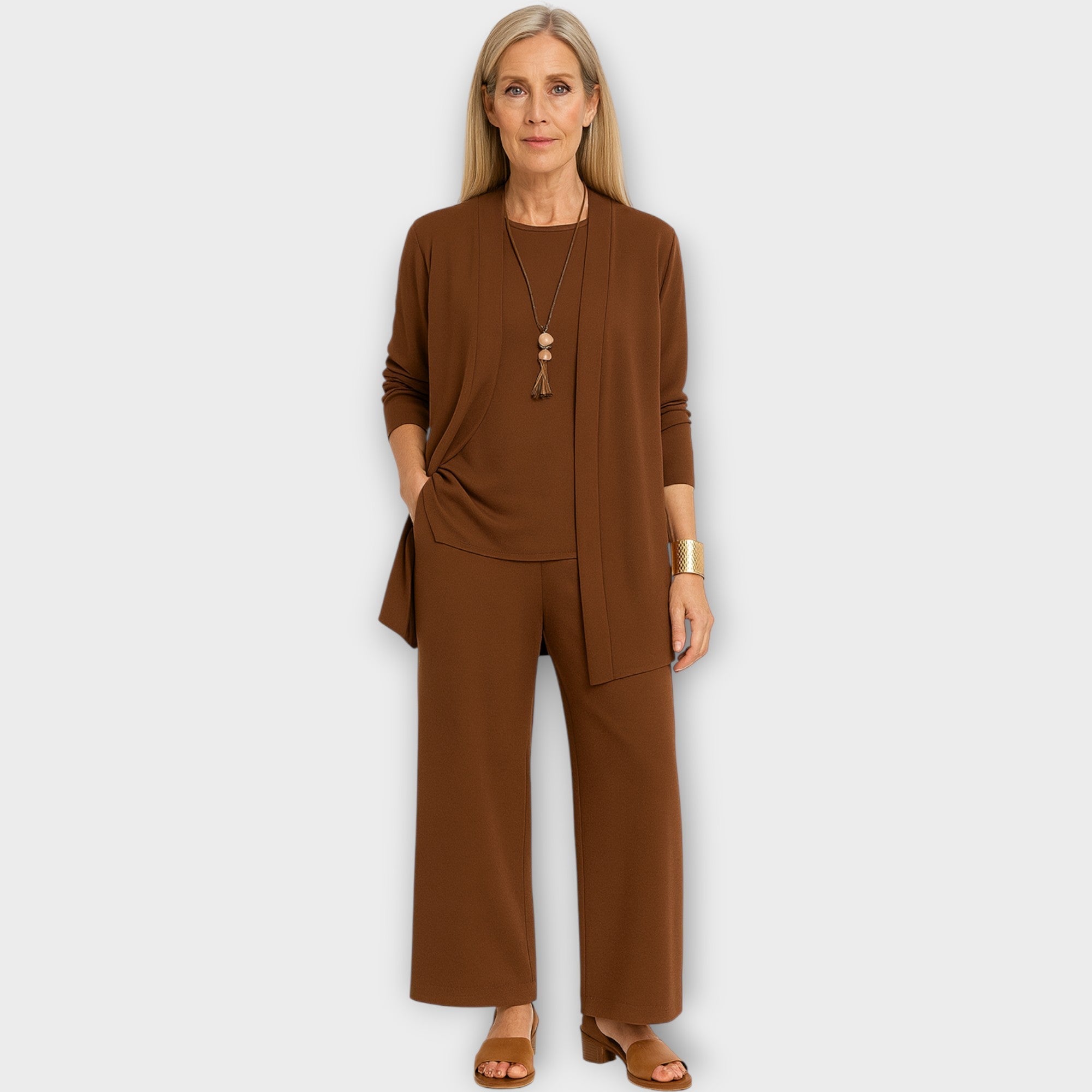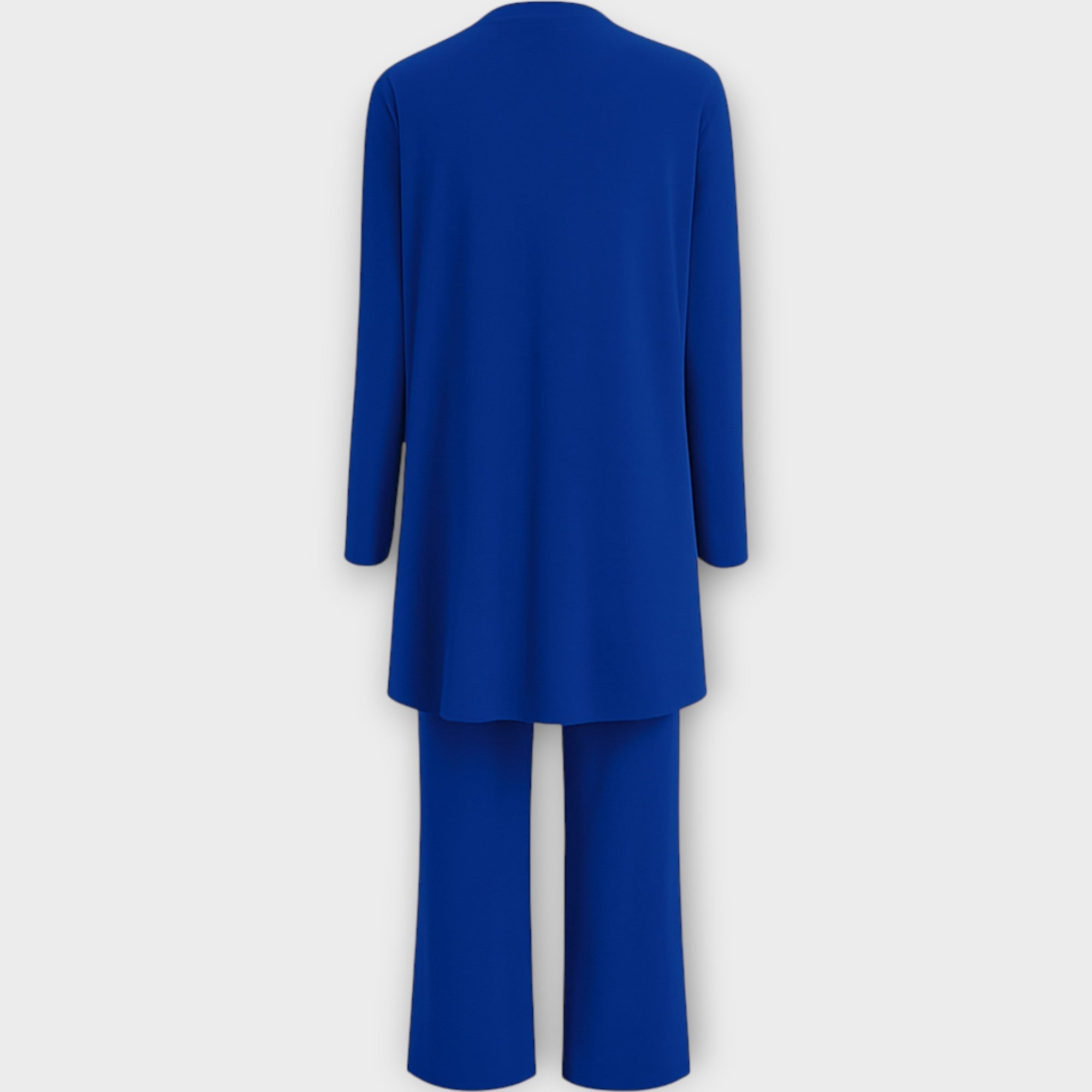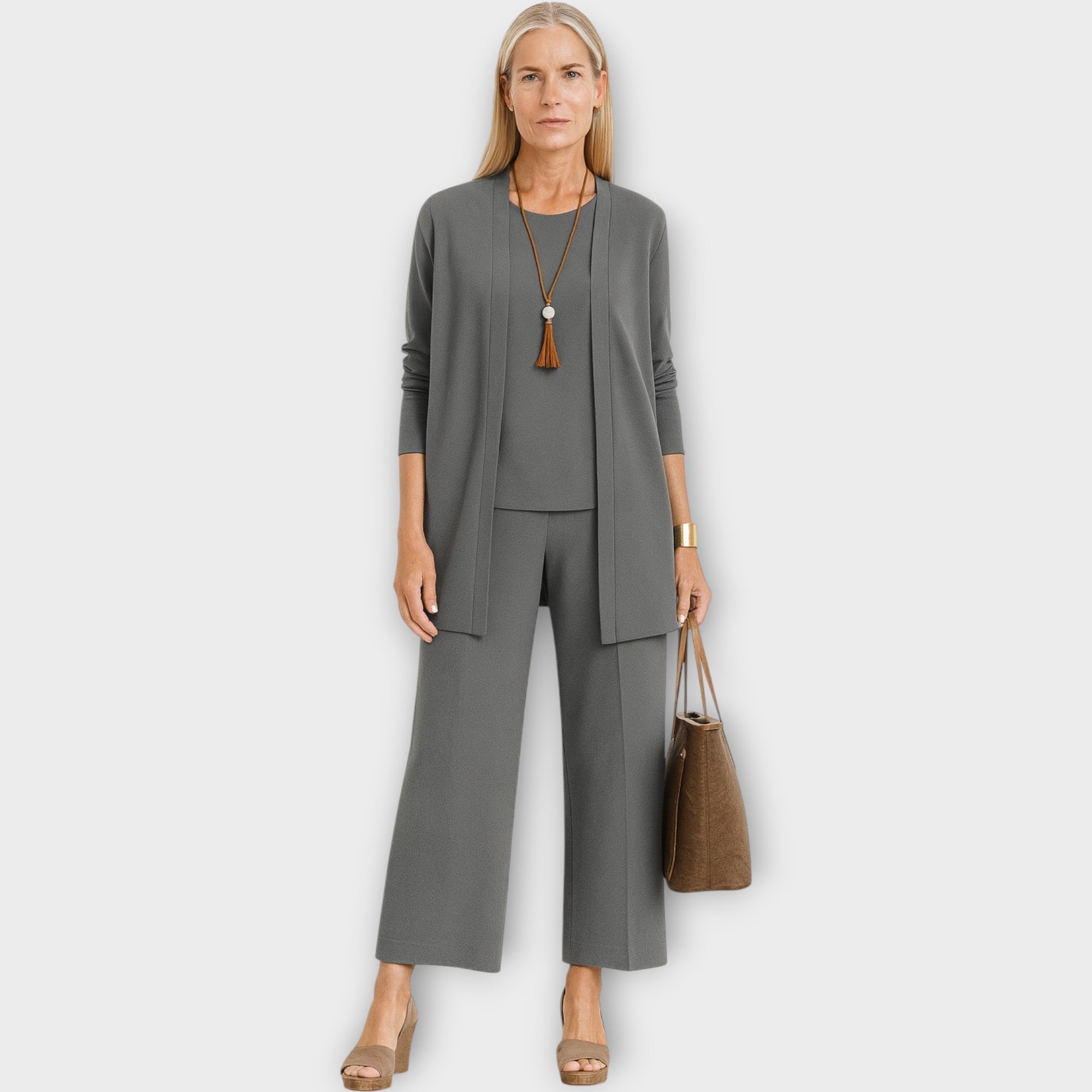 Objevte soupravu s dlouhým kardiganem a elegantní linií, která spojuje nadčasovou eleganci s praktickým komfortem. Jeho minimalistický design, volný střih a jemná textura je kousek, jenž se hodí pro každou příležitost.