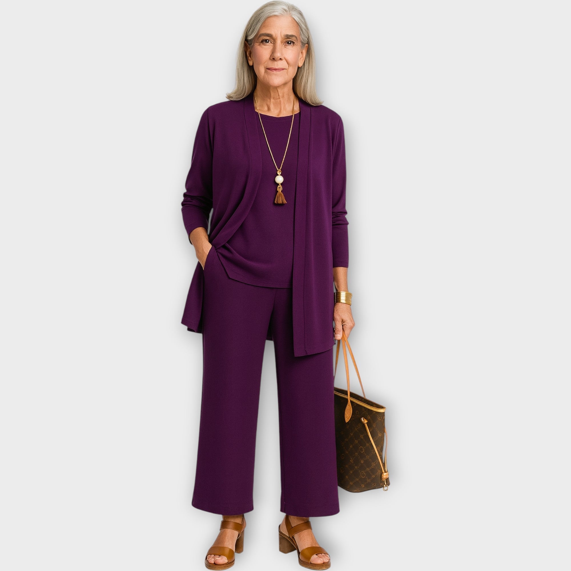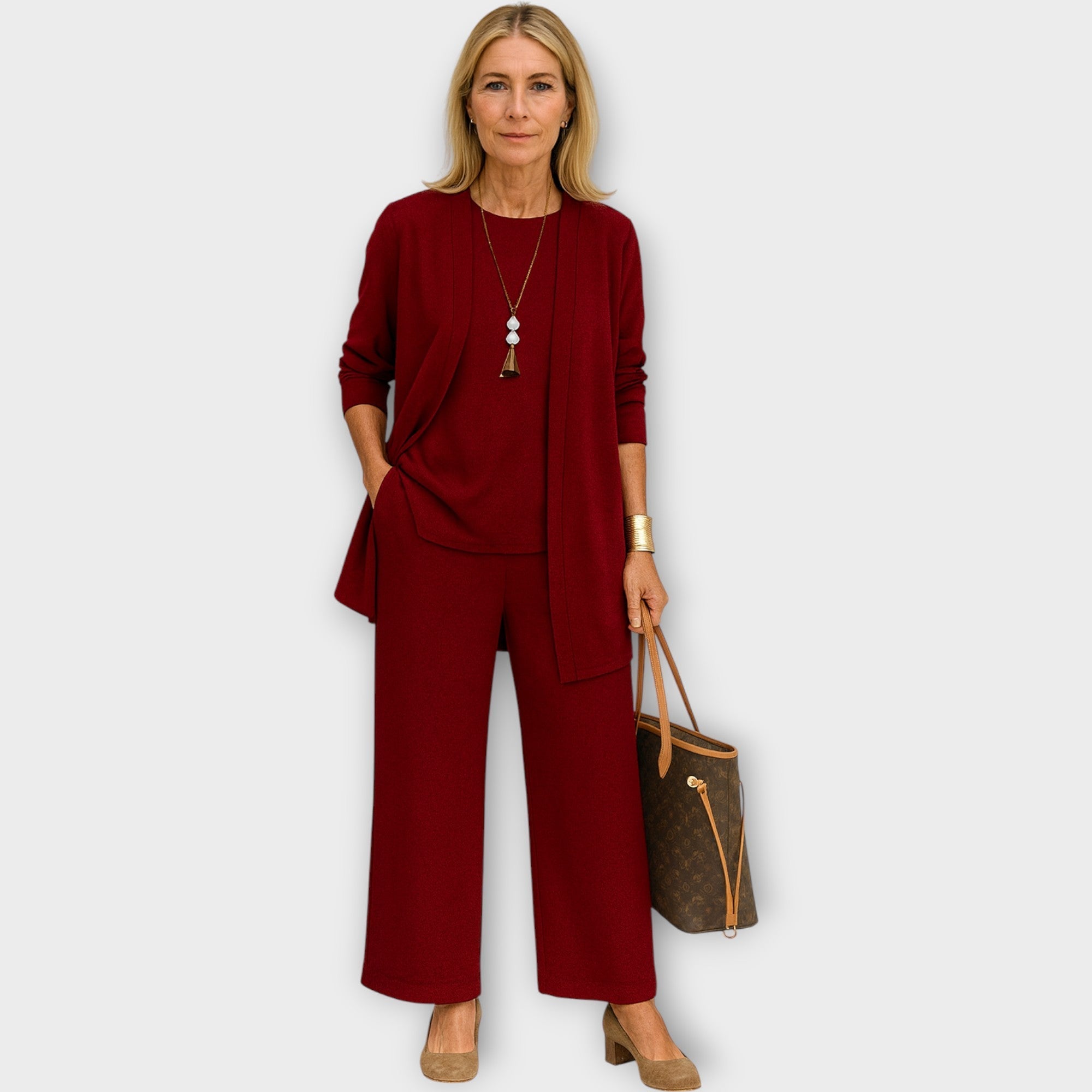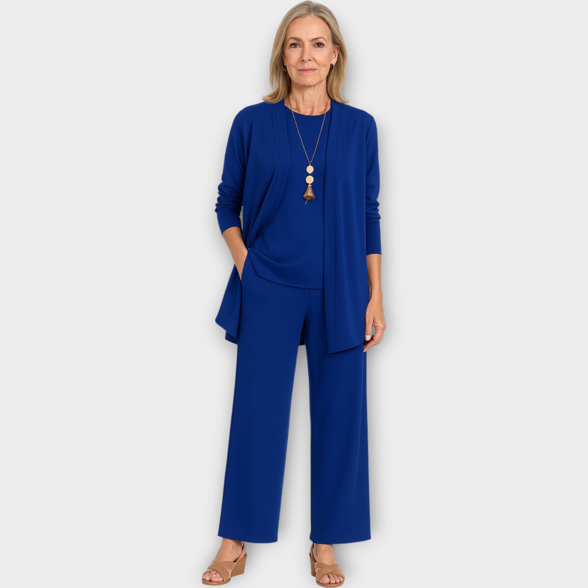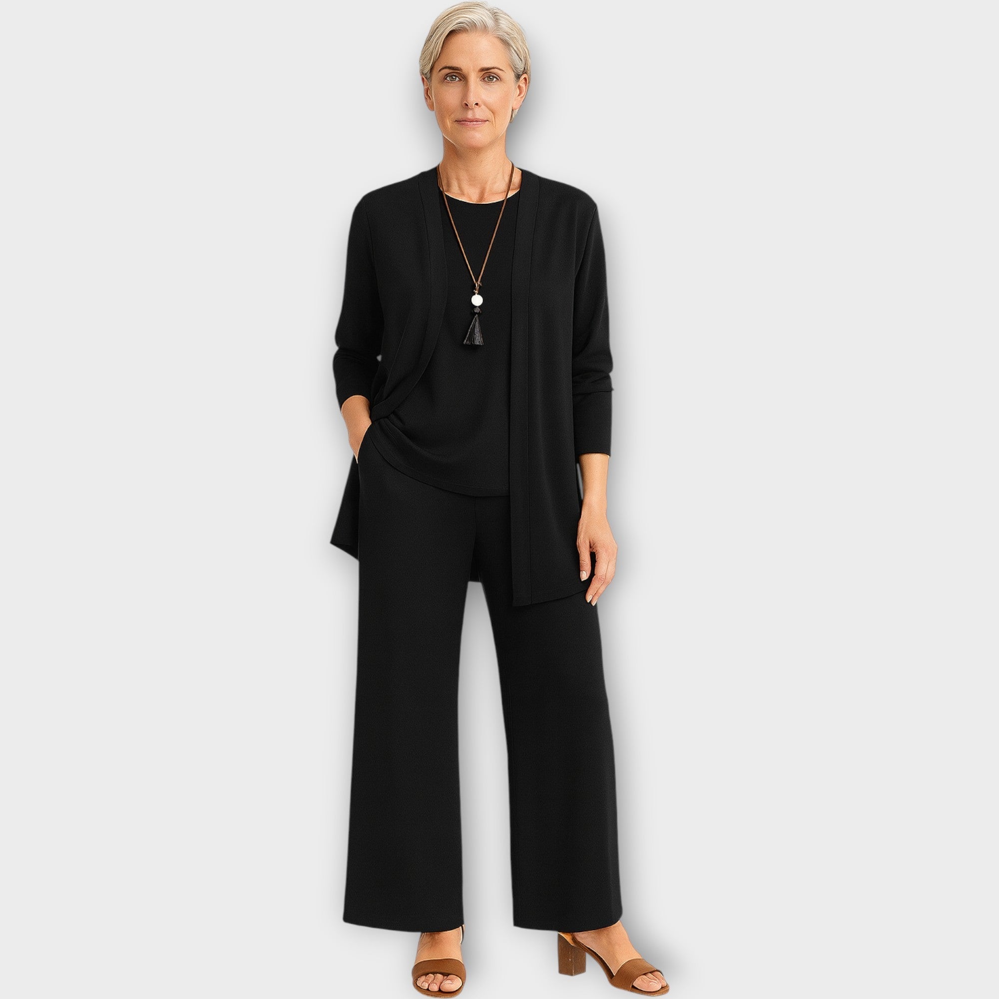 Objevte soupravu s dlouhým kardiganem a elegantní linií, která spojuje nadčasovou eleganci s praktickým komfortem. Jeho minimalistický design, volný střih a jemná textura je kousek, jenž se hodí pro každou příležitost.