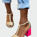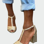 Vytvořte si slavnostní vzhled s tímto kusem, který kombinuje sofistikovaný lesk a praktickou stabilitu. Zlaté sandály s T-řemenem jsou perfektní volbou pro okamžik, kdy chcete působit jistě a stylově.