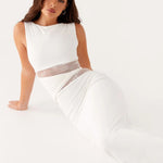 Průsvitné prvky decentně odhalují kůži a dodávají celému outfitu nádech luxusu a ženské síly.