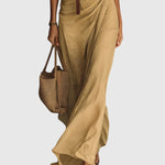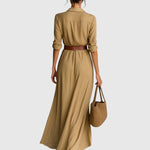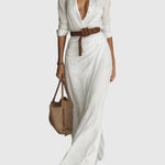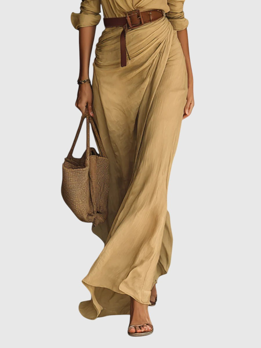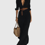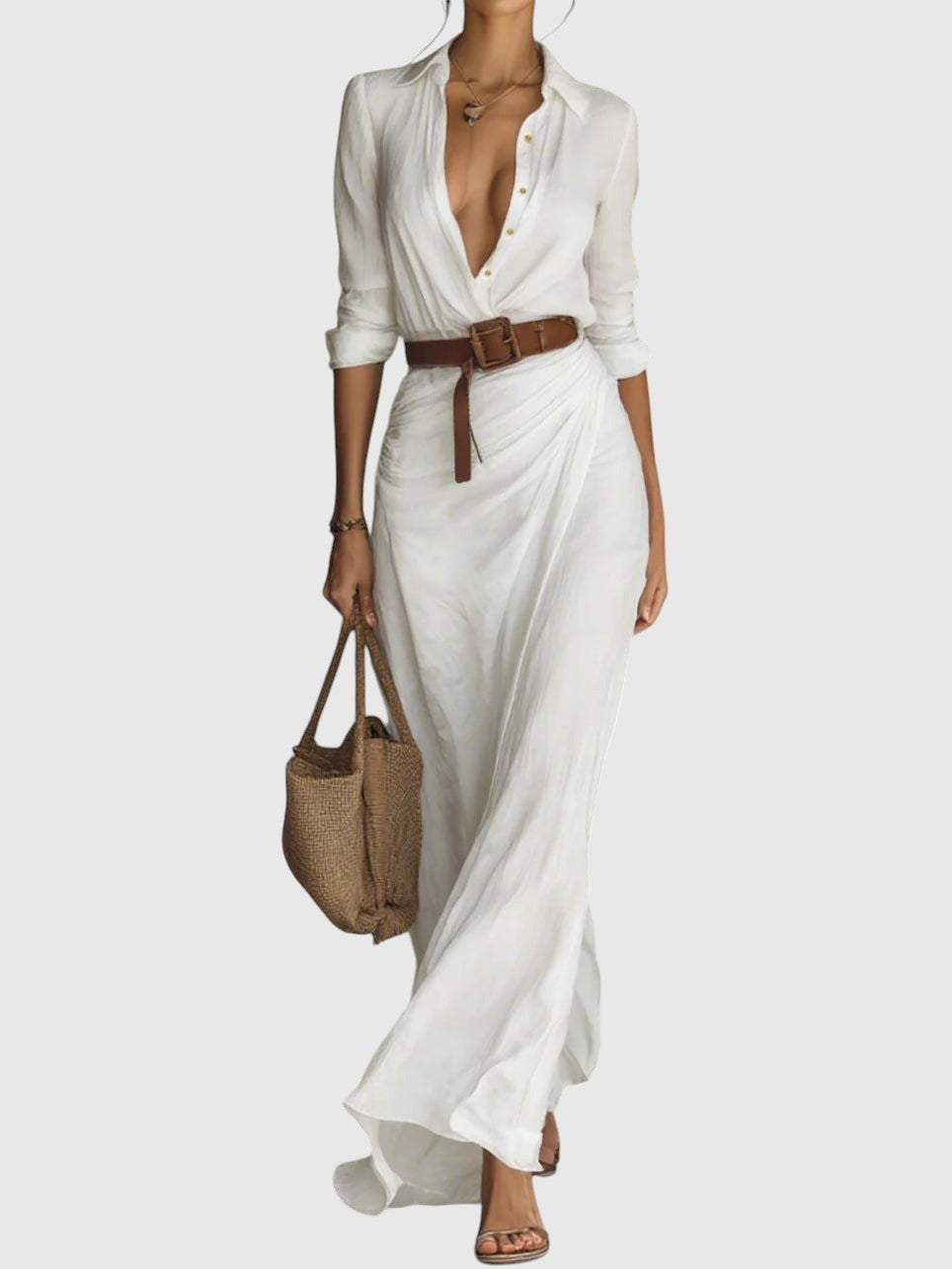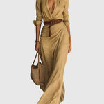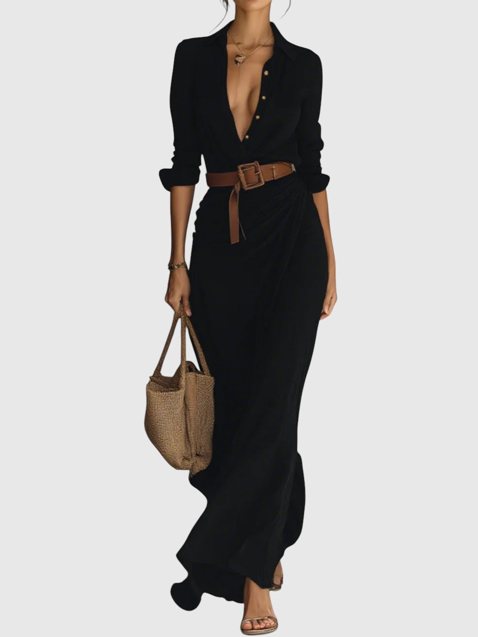Dlouhé šaty sofistikovaného designu, vyrobené z lehké a splývavé tkaniny, která zajišťuje přirozený pohyb a dokonalý střih. Mají hluboký výstřih do „V“, který zvýrazňuje dekolt, dlouhé rukávy s manžetami a zavinovací detail na sukni, který vytváří ženský a působivý vzhled. Součástí je pásek, který zvýrazní pas a podtrhne siluetu. Ideální volba jak pro volný čas, tak i pro speciální příležitosti.