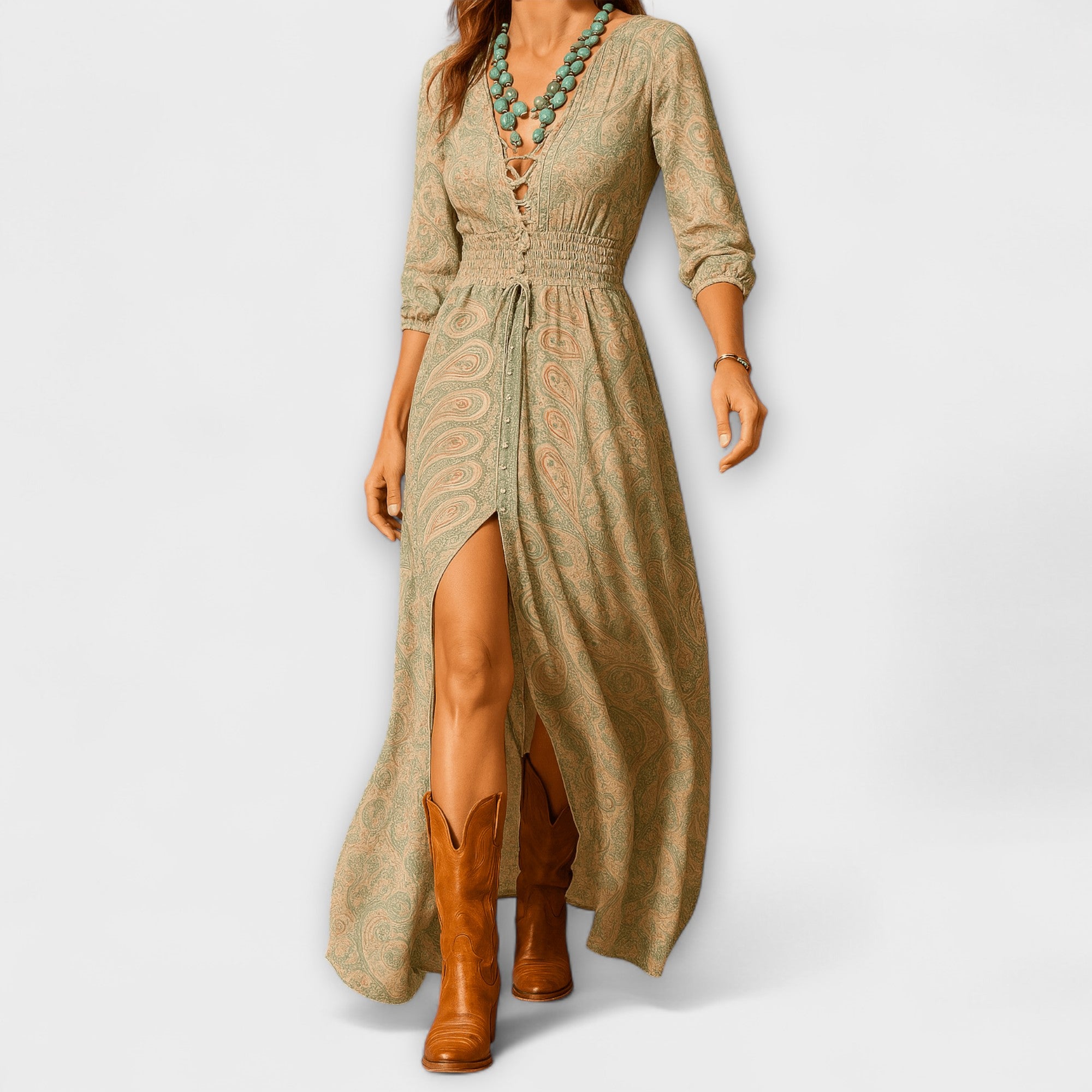 Objevte naše elegantní dámské maxi šaty s V-výstřihem, které jsou ideální na jaro a léto. Tyto šaty spojují styl a pohodlí a krásně obepínají vaše křivky. S kouzelným paisley vzorem a svůdným předním rozparkem jsou perfektní volbou pro slavnostní příležitosti nebo relaxační dny venku.