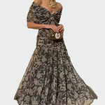 - Výstřih do V a odhalená ramena zdůrazní dekolt a ženskou siluetu.