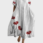 Moderní elegance — lehkost, styl a umělecký dotek v jednom kousku. Bílá základna dává nadčasový, minimalistický základ, zatímco červené květy s černými detaily výrazný kontrast, který okamžitě upoutá pozornost.