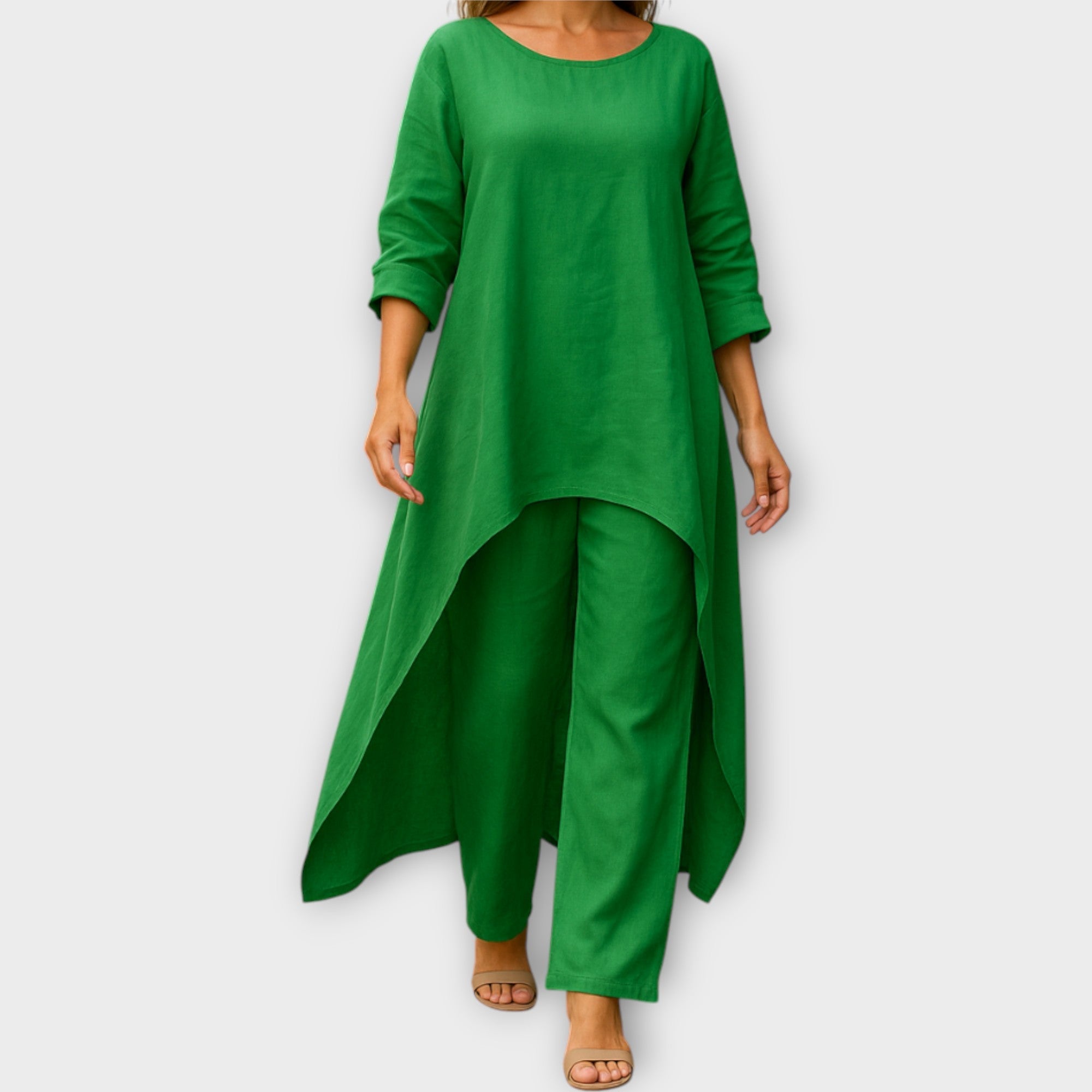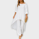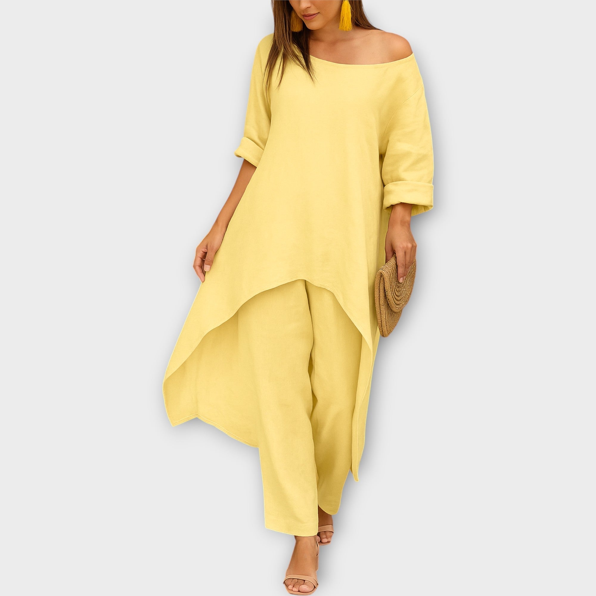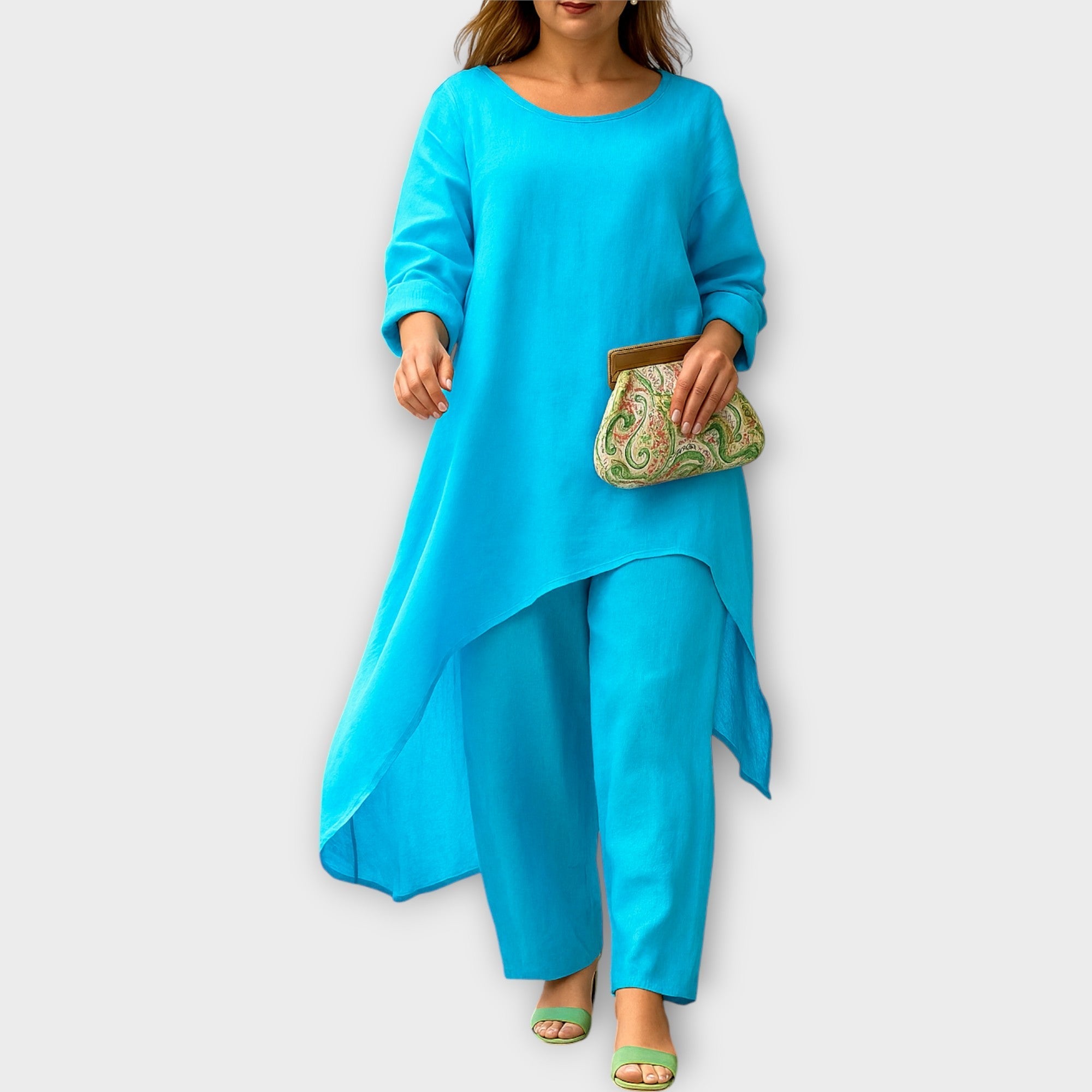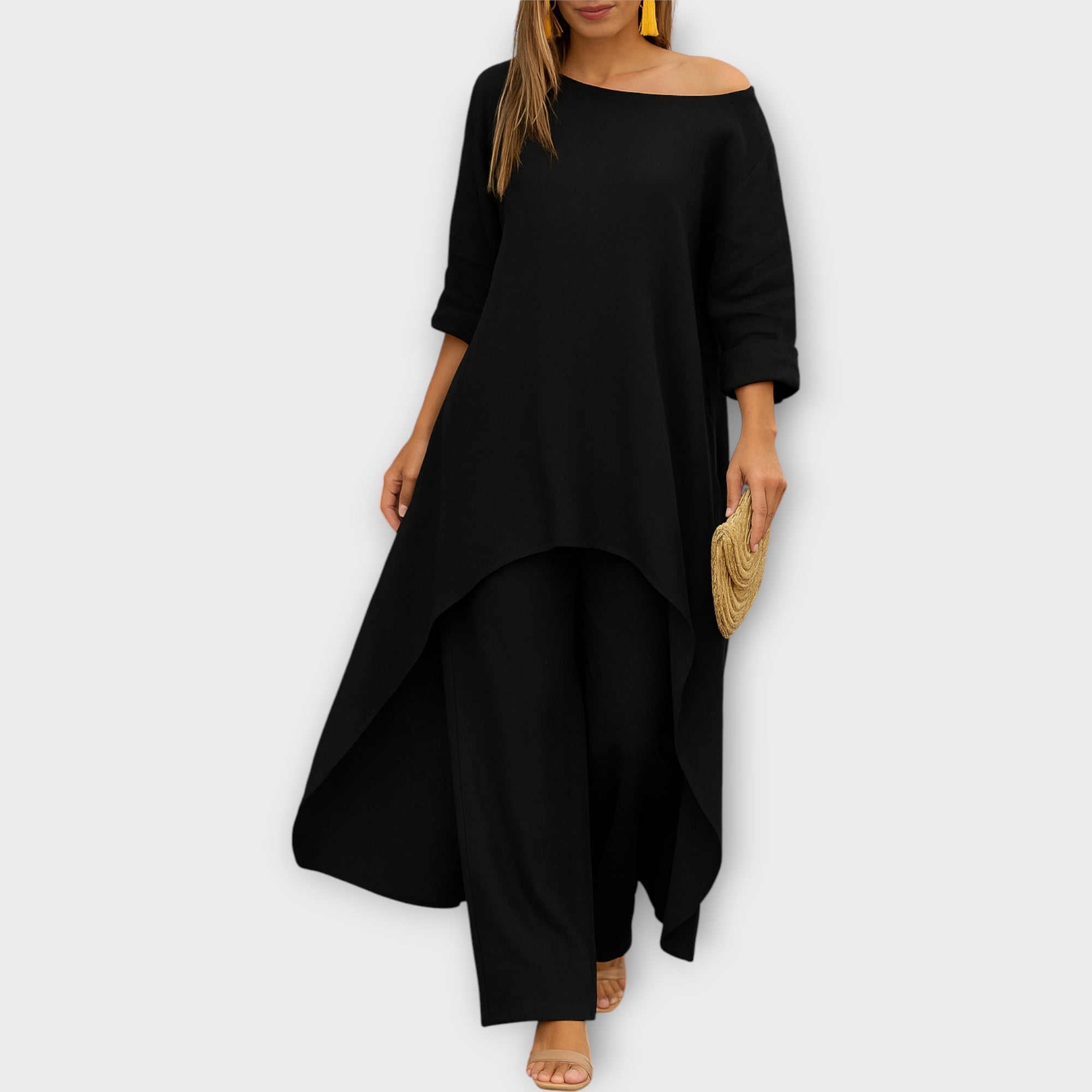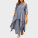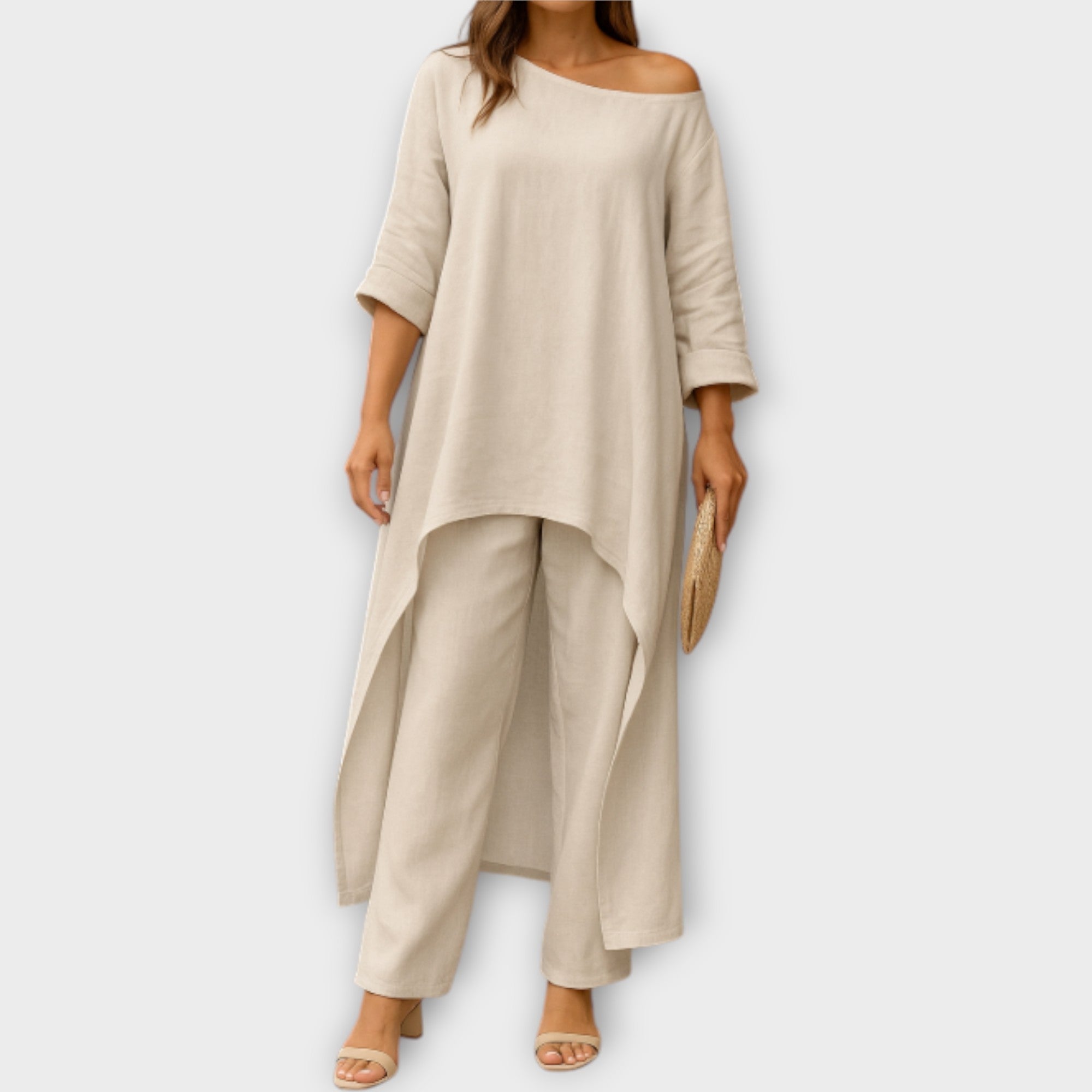 Objevte set, který spojuje pohodlí s nadčasovou elegancí. Asymetrický střih a lehká, vzdušná linie z něj činí ideální volbu pro každou příležitost — od neformálních dní až po sofistikované večery.