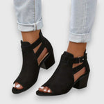 Elegantní sandály s tlustými podpatky, otevřenou špičkou a designem s výřezem. Zip na patě zajišťuje bezpečné uchycení a moderní vzhled.