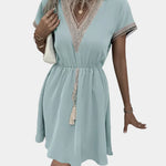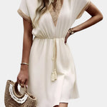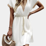 Objevte znovu romantickou eleganci tohoto boho šatu s páskem a dekoltem do V. Lehký krémový materiál spojuje pohodlí s ženským půvabem, zatímco krajkové detaily evokují středomořský šarm. Ručně vyšívané detaily na výstřih a rukávy dodávajících šatům jedinečný, ručně zpracovaný vzhled.