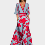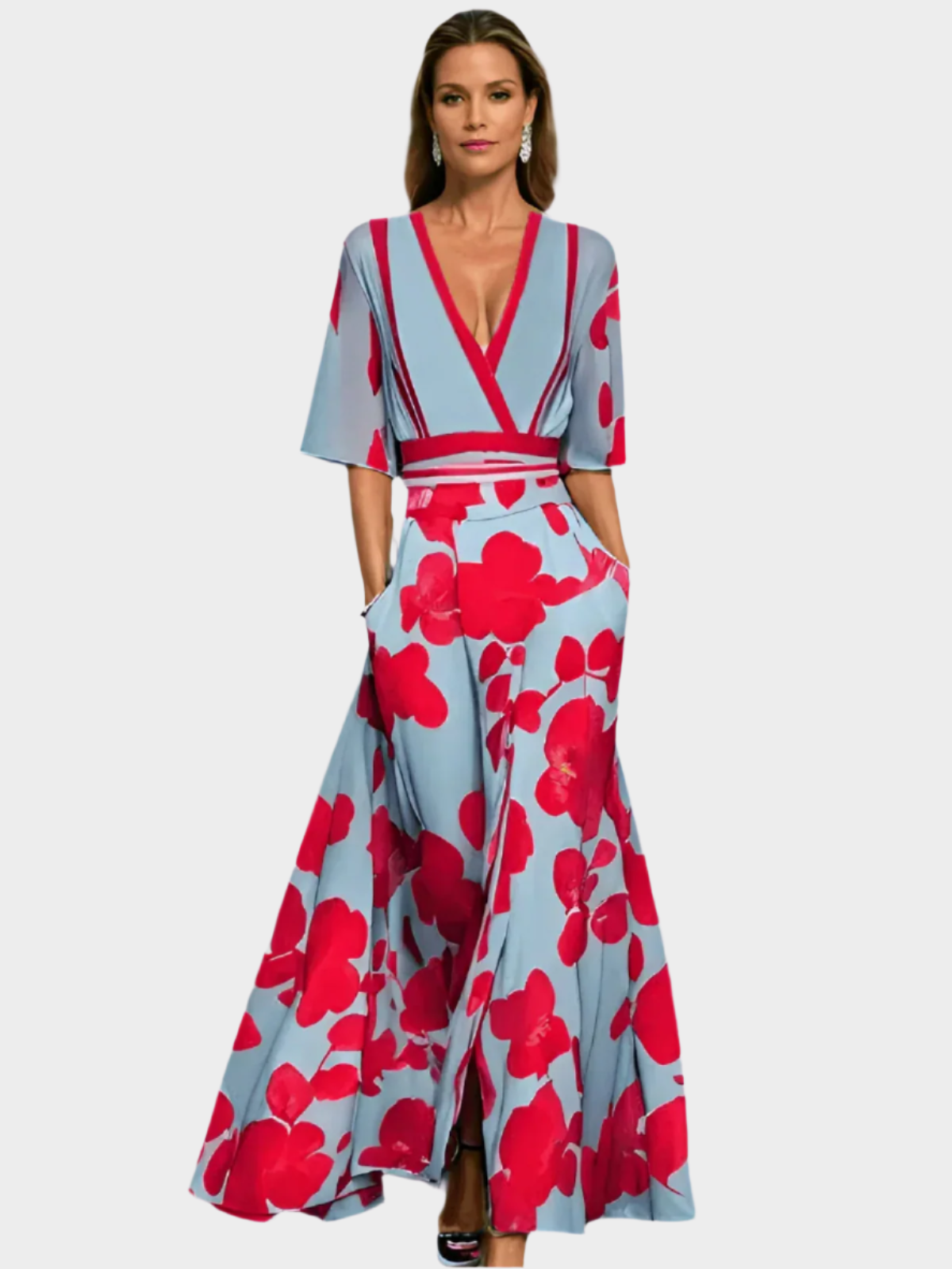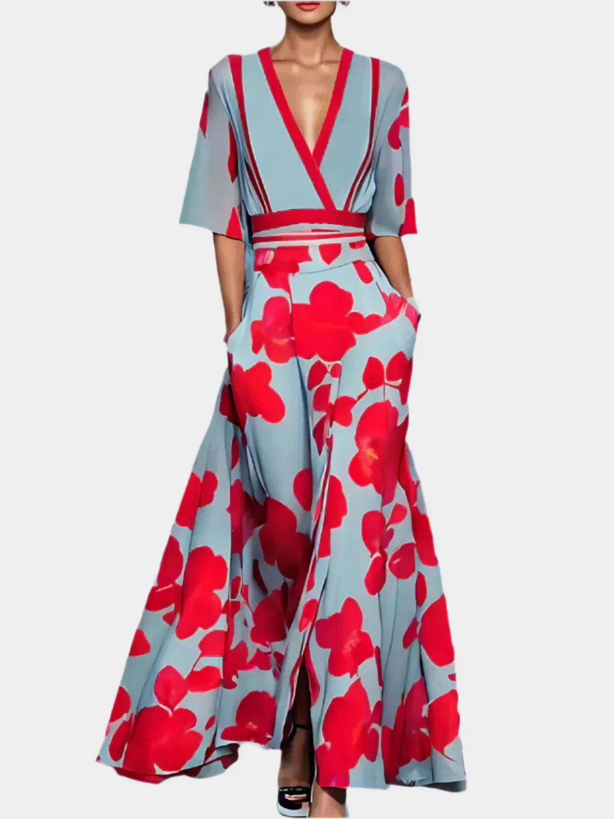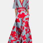 Živý květinový motiv: Velké červené květy výrazně vyčnívají na jemně modrém pozadí, což umožňuje upoutají pozornost a dodají vám svěží letní vzhled.