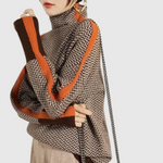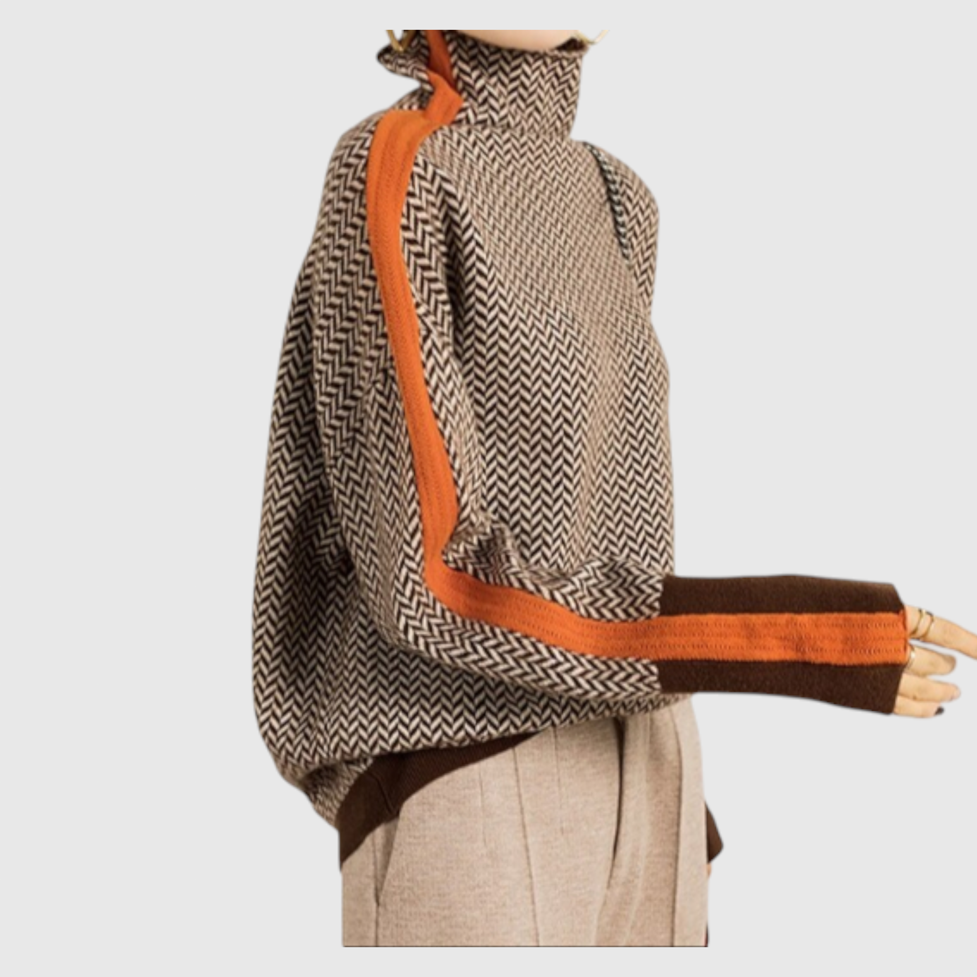 Rozlučte se s svědivými látkami a bezformými svetry. Victoria Turtleneck je vyroben z prémiového, jemného pleteného materiálu, který je hladký, lehký a pohodlný na kůži. Odvážný vzor rybí kosti s teplými oranžovými akcenty dodává moderní sofistikovanost, zatímco uvolněný, ale lichotivý střih z něj činí bezproblémový kousek pro denní i večerní nošení.