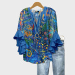 Objevte nadčasovou eleganci s touto blúzou v jasně modré barvě, která spojuje umělecký výraz se šarmem pro každodenní nošení i speciální příležitosti. Živé vzory připomínají malířský plátnový motiv a dodávají vašemu stylu jedinečný jedinečný nádech originality.