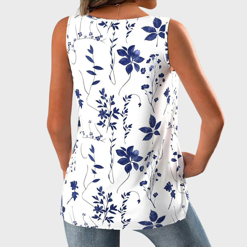 Objevte letní svět s topem Χάρη & Ραφή. Bílá základna zdobená stylovými modrými květinovými motivy dodává svěží dojem, který se hodí pro každodenní i letní outfity.