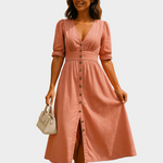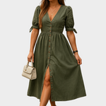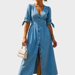 Džínové maxi šaty na knoflíky jsou ideální volbou pro elegantní a zároveň pohodlné outfity. Disponují výstřihem do V, knoflíky po celé délce a 3/4 rukávy se zavázáním do mašličky. Guma v pase podtrhuje linii postavy a dodává šatům pružnost při každém pohybu. Vyrobené z měkkého džínového materiálu pro pohodlné nošení. Maxi délka dodává šarm a univerzálnost pro různá prostředí.
