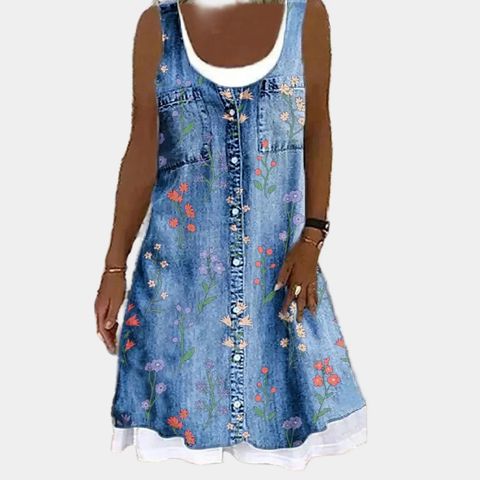 Měkké Džínové Šaty Bez Rukávů S Knoflíky Květinovým Motivem