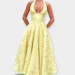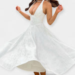 Korzet na hrudi objímá tělo a vytváří lichotivou postavu, zatímco otevřená záda s nastavitelným zapínáním umožňuje dokonalé padnutí. Lehká midi sukně poskytuje jemný, elegantní pohyb, lesklý florální vzor dodává šarm a světélkující efekt, který přitahuje pohledy.