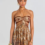Šaty jsou ideální volbou pro večerní vycházky, koktejlové párty letní oslavy , které vyžadujíglam vzhled a výrazný styl. Kombinace zlaté, hnědé a terakotové palety vytváří teplý, bohatý vzhled, který svítí ve světle reflektorů a ještě podtrhuje vaši postavu.