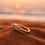 Prsten Aella zachycuje podstatu saharských písku zahalených šerem, kde každé zrnko skrývá tajemství. S jemným designem a krystalově zdobeným povrchem, který napodobuje přirozenou texturu duny ve slabém světle, vyzařuje Thalia majestátní klid – okamžik ticha zachycený ve zlatě.
