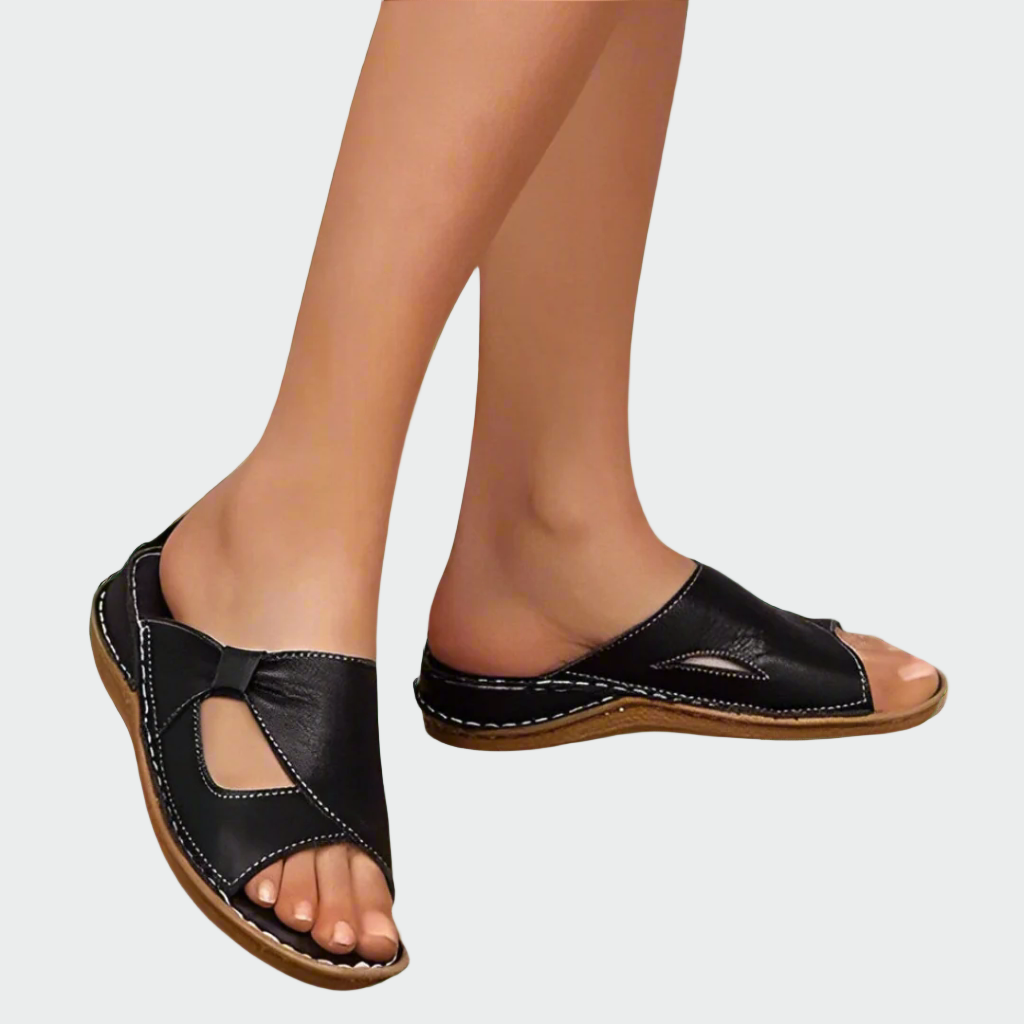 Stylové nízké sandály z černé kůže s kontrastním šitím spojují jednoduchost a praktičnost pro vaše každodenní pohodlí. Moderní design s otevřeným předním dílem umožňuje noze dýchat, zatímco nízký podpatek a pevná podrážka zajišťují stabilní a pohodlné kroky. Kožená konstrukce s elegantním zakončením dodává dlouhodobou trvanlivost a sofistikovaný vzhled. Prodyšný design zajišťuje svěží pocit po celém dni. Ideální pro domácí nošení i pro pohodové procházky, kdy chcete klidně odpočívat bez kompromisů v pohodlí.