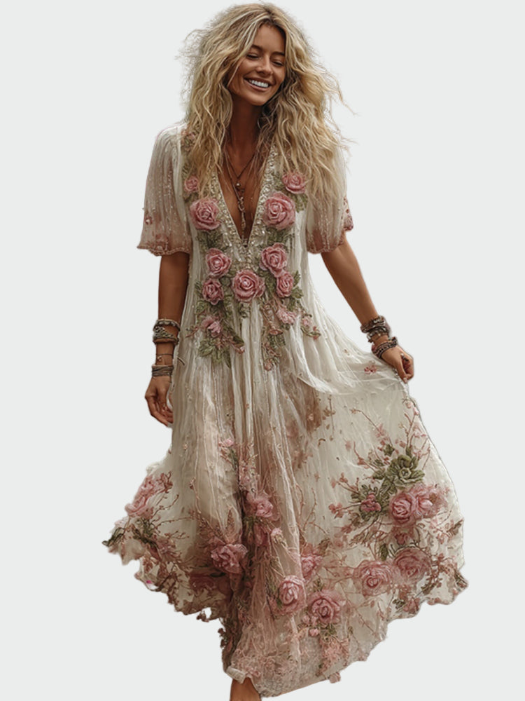 Lněné Maxi Šaty S Květinovou Výšivkou Boho Šarm Růžové
