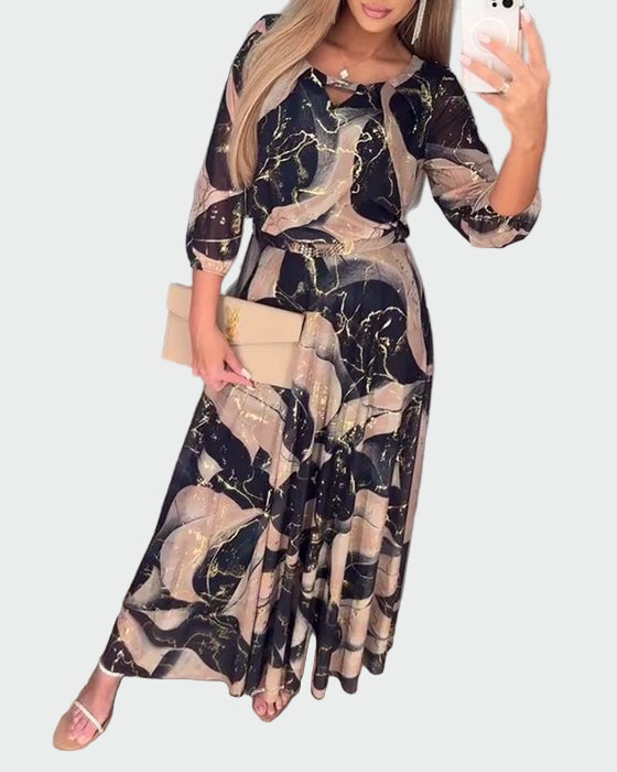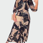 Šifónové midi šaty Trevina přinášejí noc plnou luxusu a elegance. Unikátní vzor v tmavých odstínech s výraznými zlatými detaily dodává aristokratický nádech, ideální pro výjimečné příležitosti.