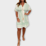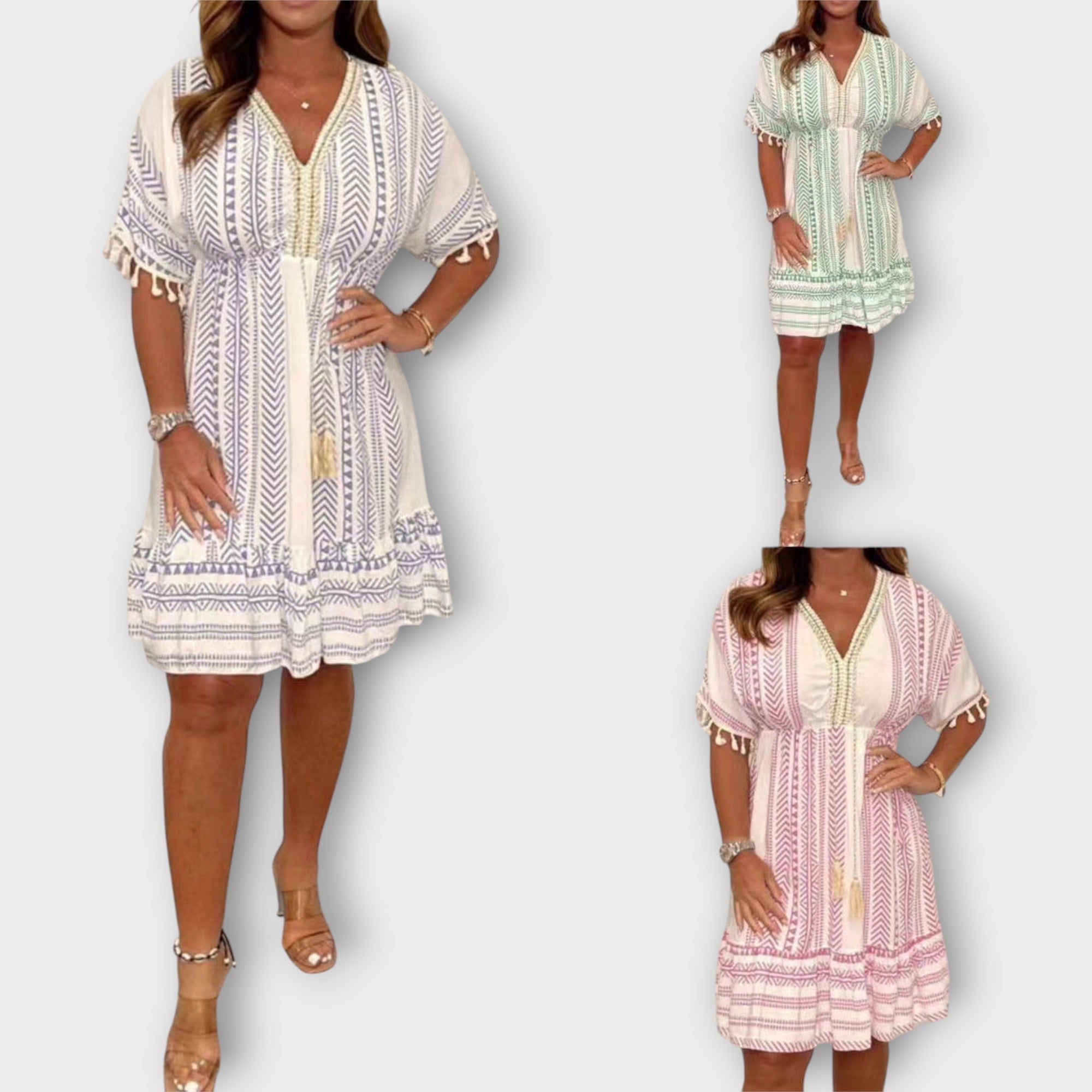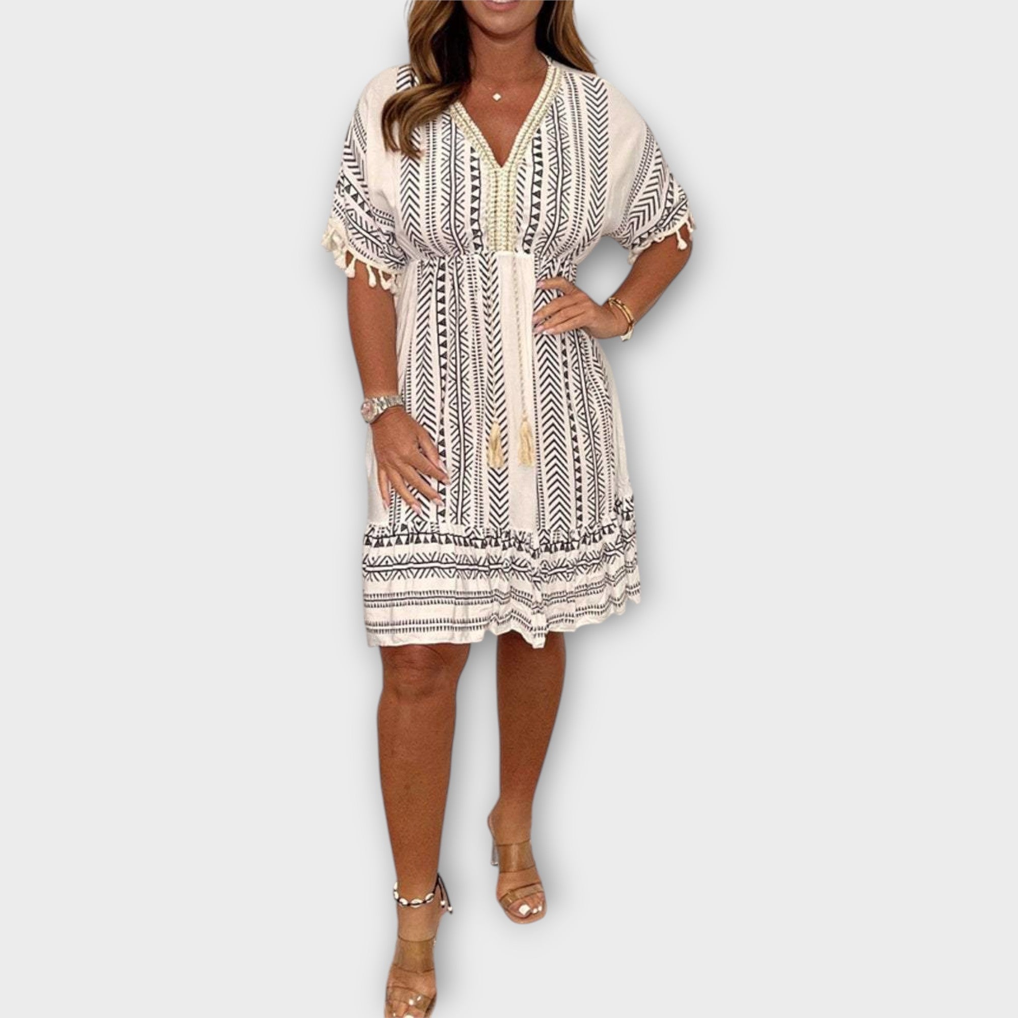 Krátké šaty s volným střihem a diskrétními detaily spojující pohodlí s jemnou elegancí – ideální volba pro každodenní okamžiky i zvláštní příležitosti.