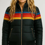 Naomy představuje dobrodružný model, který spojuje živé barvy a funkční design. Ideální pro chladné dny, tato vícebarevná péřová bunda je určena pro dynamické ženy, které hledají pohodlí a originalitu ve svých zimních outfitech.