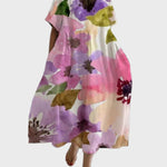 Podtrhněte svou aristokratickou eleganci s tímto dlouhým šatem v pohodlném střihu, zdobeným výraznými volnými květinovými motivy v odstínech růžové, fialové a zelené. Lehký, vzdušný materiál a pohodlná letní silueta z něj činí ideální kousek pro stylové a pohodlné outfity.