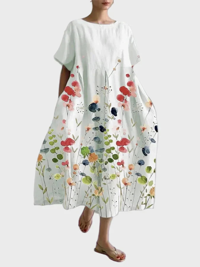 Šaty v romantickém střihu zajišťující pohodlný a ženský pohyb po celý den — ať už jdete na procházku, vyrazíte na výlet, nebo se chystáte na letní akci. Elegantní kombinace bílé základny a živých odstínů květin podtrhuje vaši svěžest a důvtipný styl.